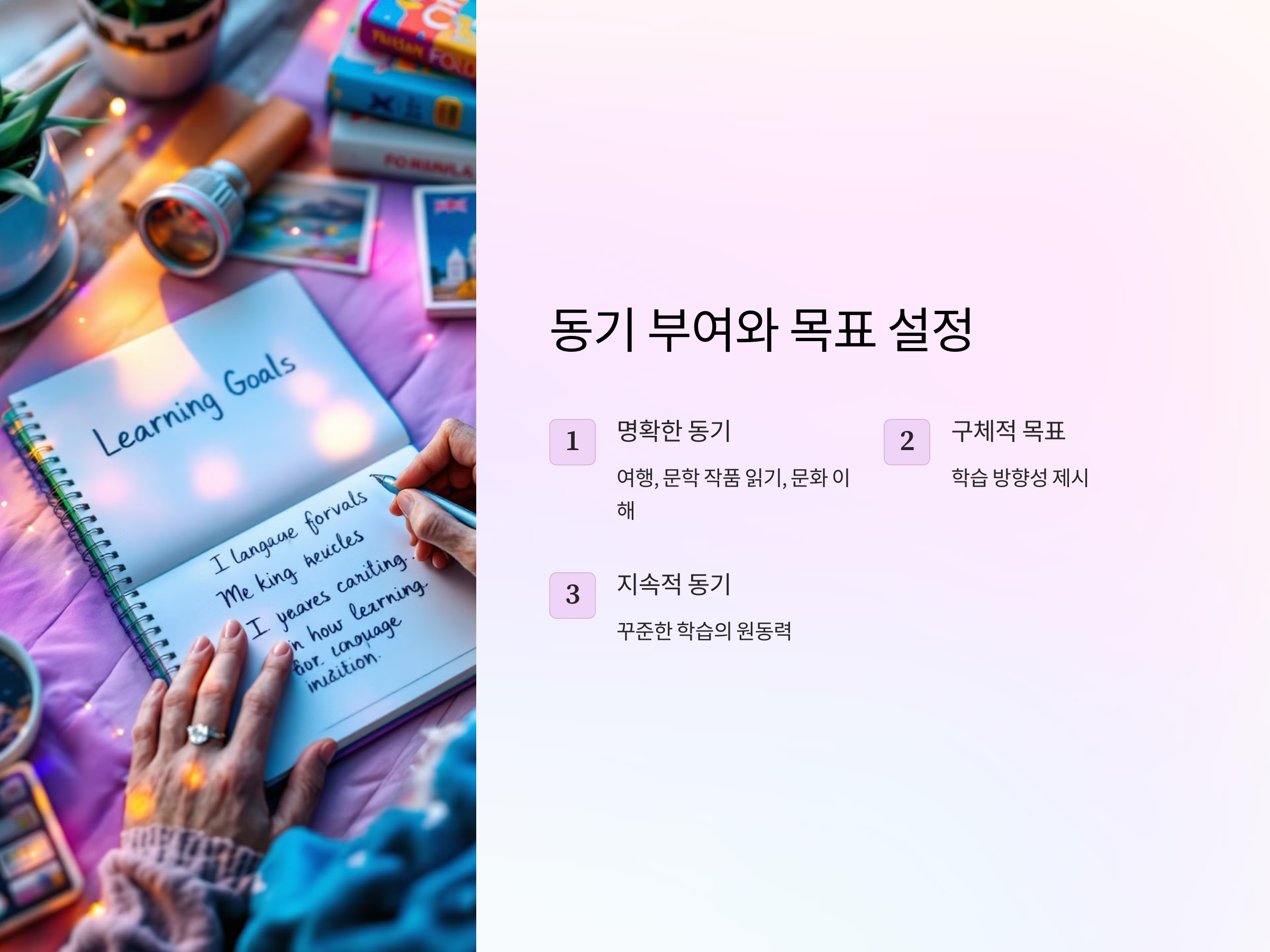 외국어 학습을 시작하기 위해서는 먼저 명확한 동기와 목표를 설정하는 것이 중요합니다. 예를 들어, 여행을 위한 간단한 회화 습득, 해외 문학 작품 읽기, 또는 새로운 문화 이해 등이 동기가 될 수 있습니다. 이러한 구체적인 목표는 학습의 방향성을 제시하고 지속적인 동기 부여에 도움이 됩니다. citeturn0search0