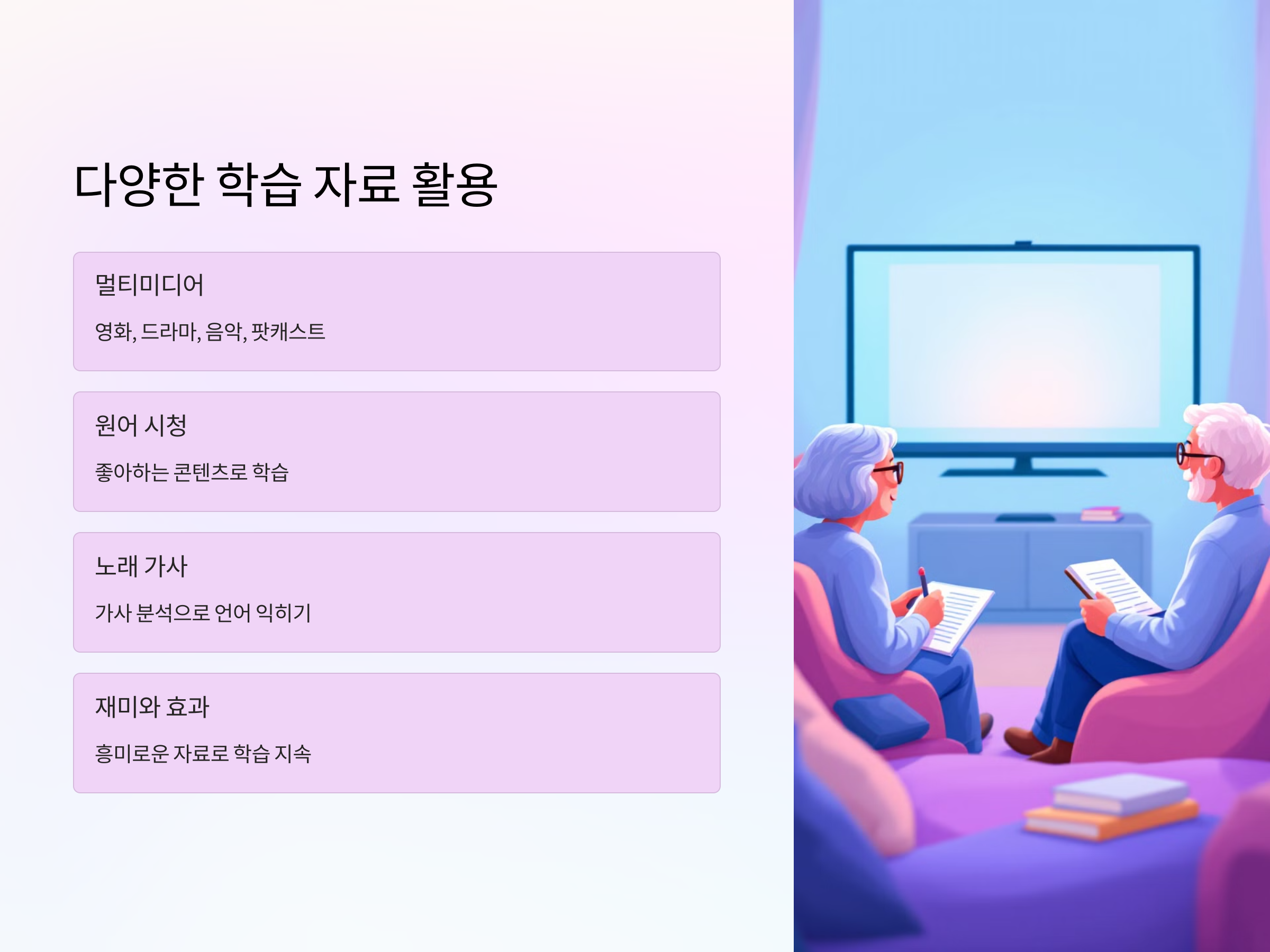 교재뿐만 아니라 영화, 드라마, 음악, 팟캐스트 등 다양한 멀티미디어 자료를 활용하면 학습의 재미와 효과를 높일 수 있습니다. 예를 들어, 좋아하는 영화나 드라마를 원어로 시청하거나, 노래 가사를 분석하며 언어를 익히는 것도 효과적입니다. citeturn0search6
