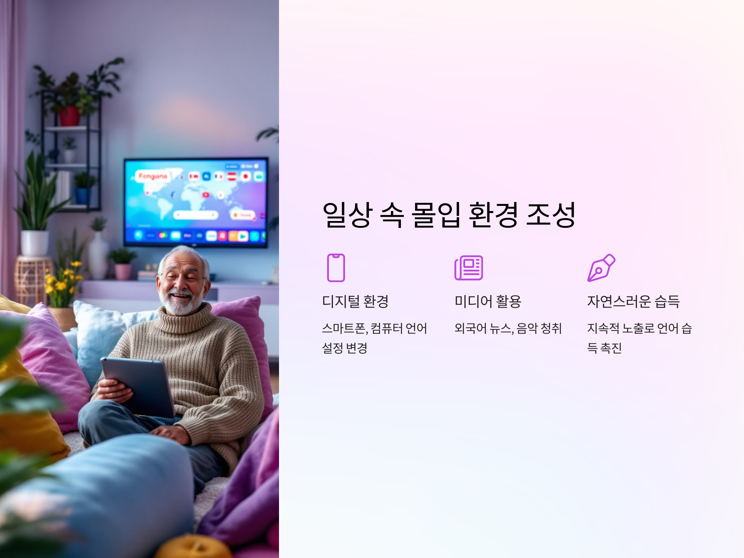 언어를 효과적으로 배우기 위해서는 일상 속에서 해당 언어에 지속적으로 노출되는 것이 중요합니다. 스마트폰과 컴퓨터의 언어 설정을 학습 중인 언어로 변경하거나, 해당 언어로 된 뉴스나 음악을 듣는 것도 좋은 방법입니다. 이러한 몰입 환경은 자연스럽게 언어 습득을 촉진합니다. citeturn0search1
