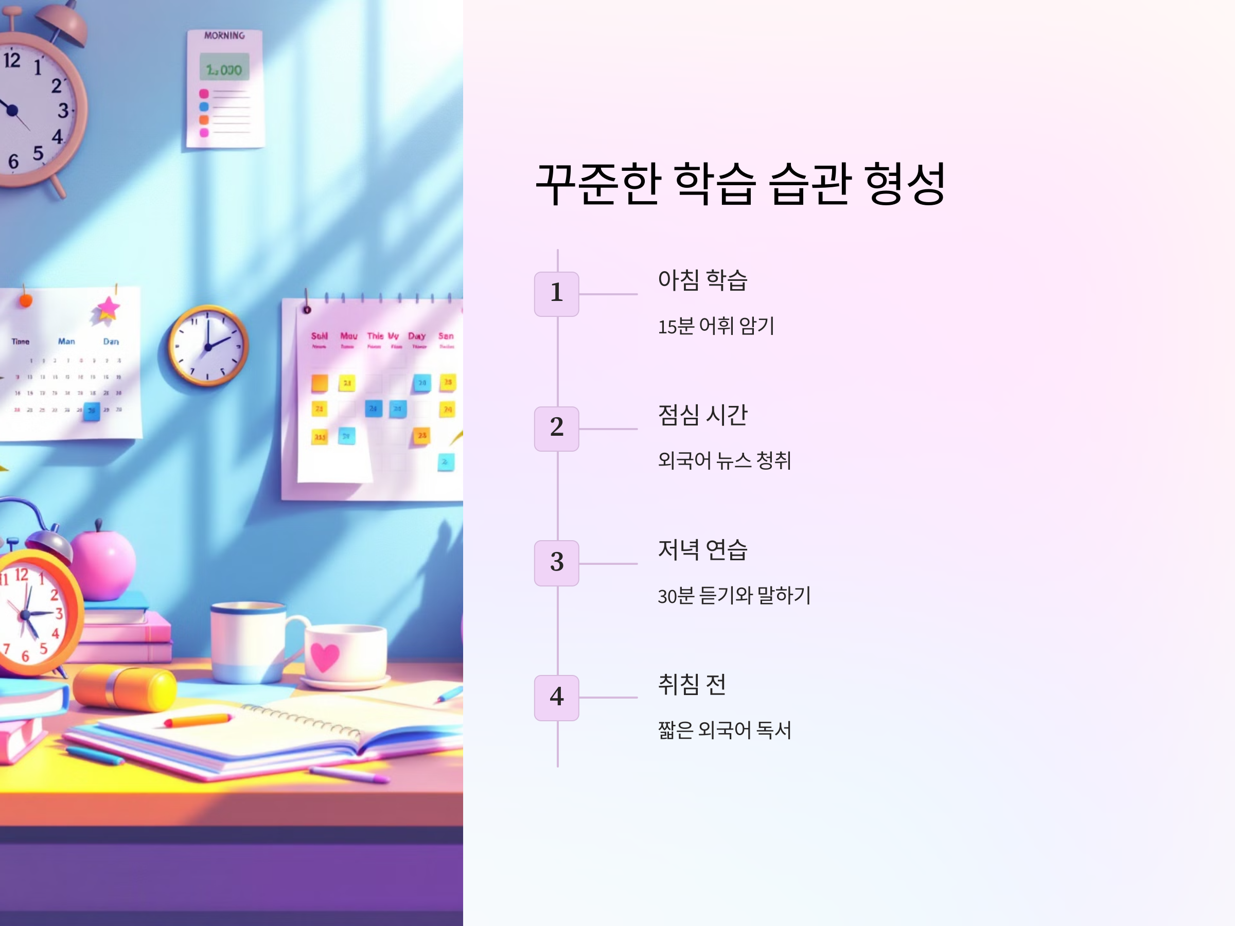 매일 일정한 시간을 정해 꾸준히 학습하는 것이 중요합니다. 예를 들어, 아침에는 15분 동안 어휘를 암기하고, 저녁에는 30분 동안 듣기와 말하기를 연습하는 식으로 구성할 수 있습니다. 이러한 반복적인 학습 루틴은 장기적으로 성과를 만들어내며, 습관이 형성되면 학습에 대한 부담감도 줄어듭니다. citeturn0search8