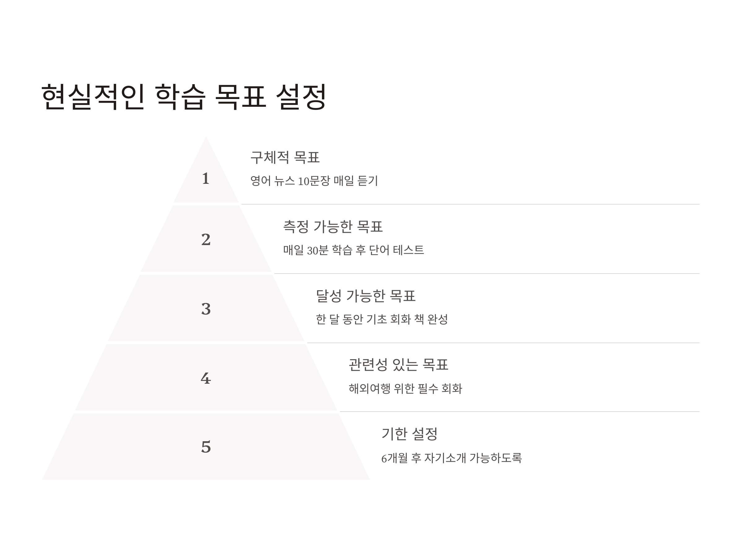 - Time-bound(기한 설정): "6개월 후 외국어로 자기소개 가능하도록 학습."
