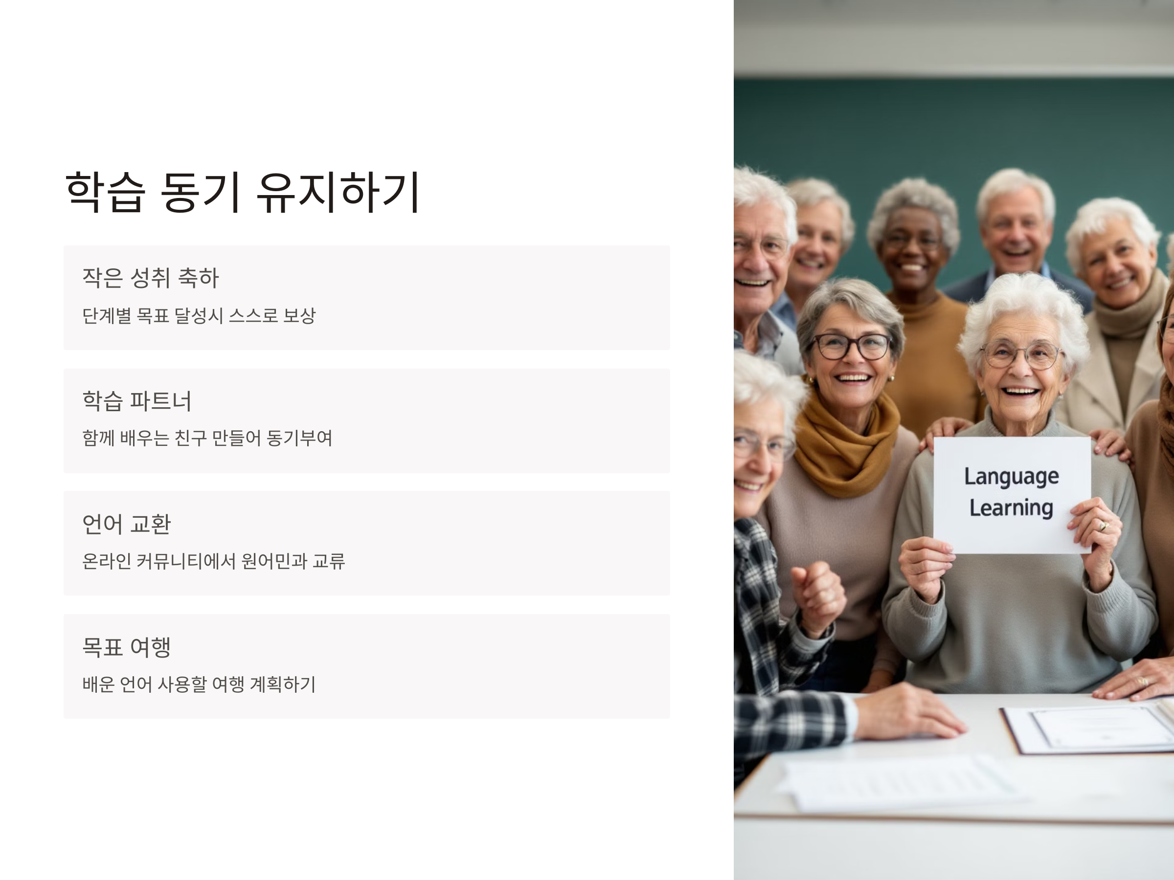 퇴직 후에도 외국어를 배우고 싶지만 작심삼일이 되어버리진 않나요? 외국어 학습은 꾸준함이 핵심이며, 적절한 방법을 활용하면 오랜 시간 흥미를 잃지 않고 지속할 수 있습니다. 최신 연구에 따르면, 나이가 들어도 새로운 언어를 배우는 것이 뇌 건강에 긍정적인 영향을 미치며, 치매 예방에도 효과적이라고 합니다. 특히, 디지털 학습 도구와 온라인 커뮤니티를 활용하면 집에서도 쉽게 외국어를 연습할 수 있습니다.