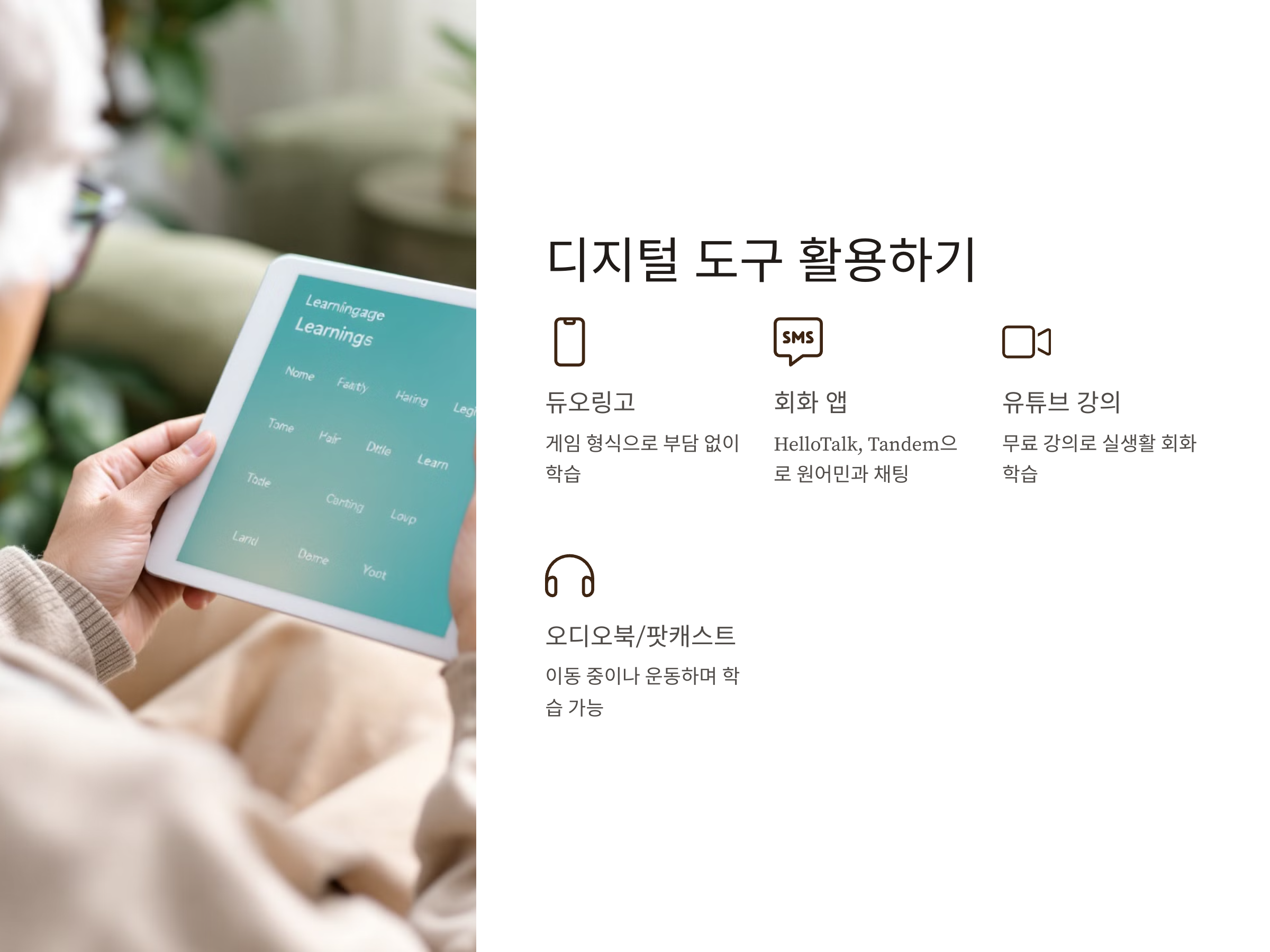 이러한 디지털 도구를 활용하면 정해진 시간에 공부하는 것보다 자유롭게 학습할 수 있어 퇴직 후에도 부담 없이 외국어를 배울 수 있습니다.