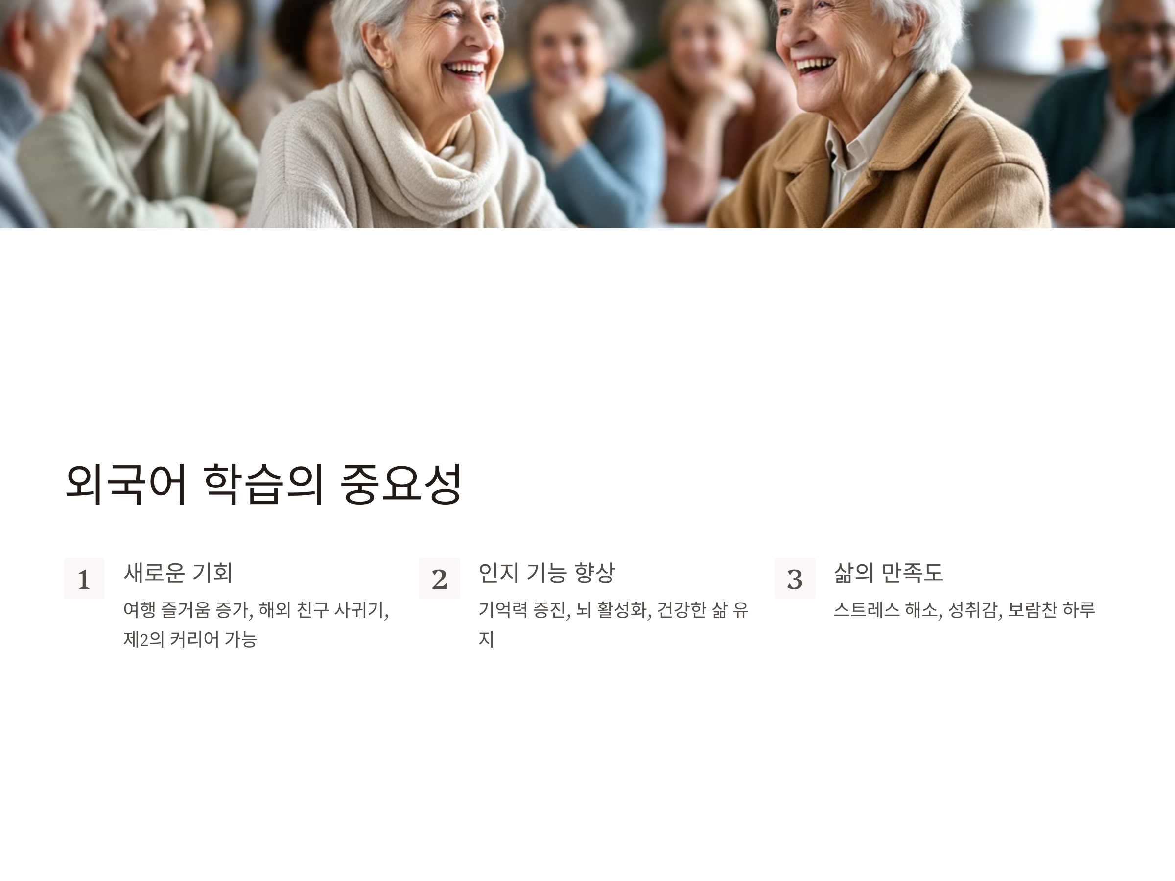 퇴직 후에는 더 이상 직장에서의 실무적 필요성이 없기 때문에 학습 동기가 줄어들 수 있습니다. 하지만 이 시기에 외국어를 배우면 단순한 취미를 넘어서 새로운 기회를 열 수 있습니다. 외국어를 배우면 여행이 더욱 즐거워지고, 해외 친구를 사귈 수도 있으며, 심지어 제2의 커리어를 시작할 수도 있습니다.