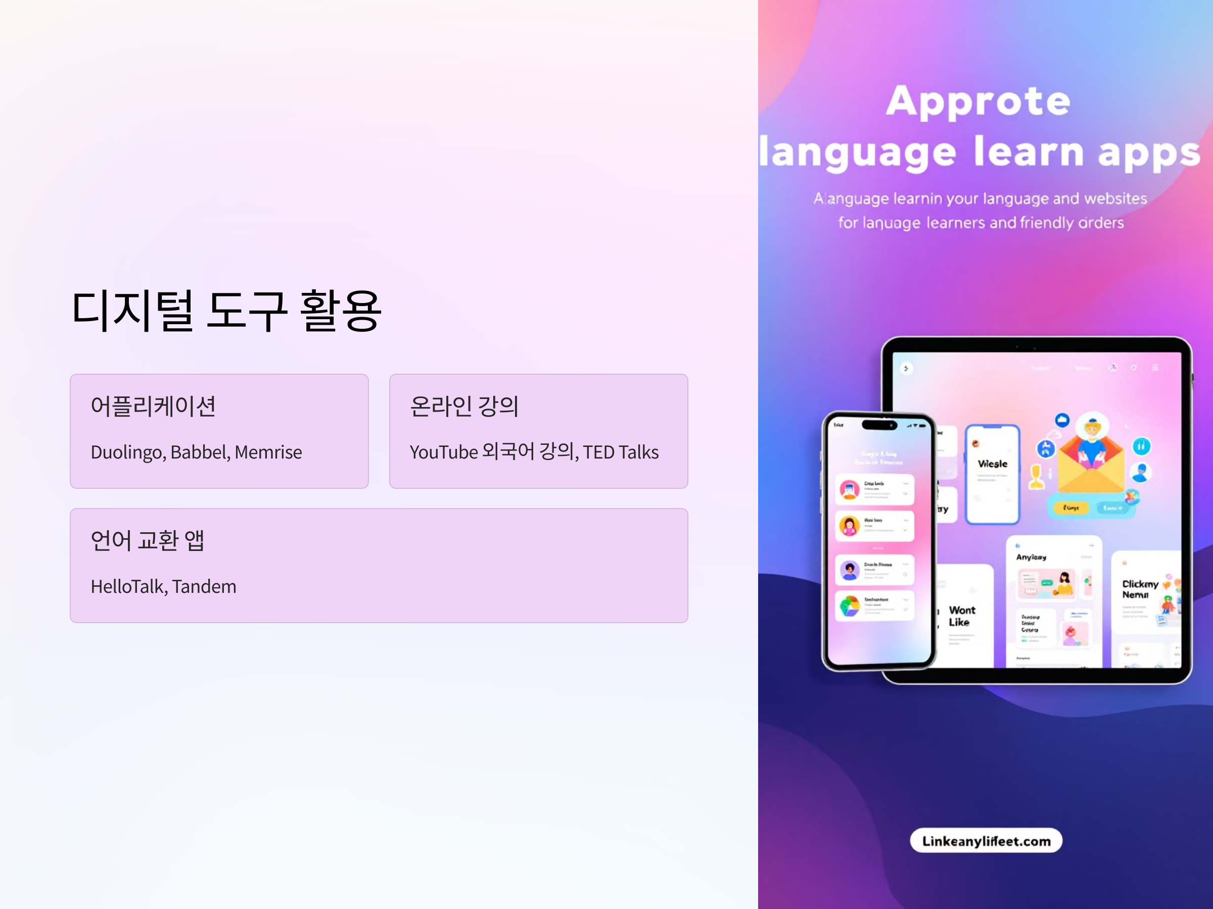 - 어플리케이션: Duolingo, Babbel, Memrise 등
