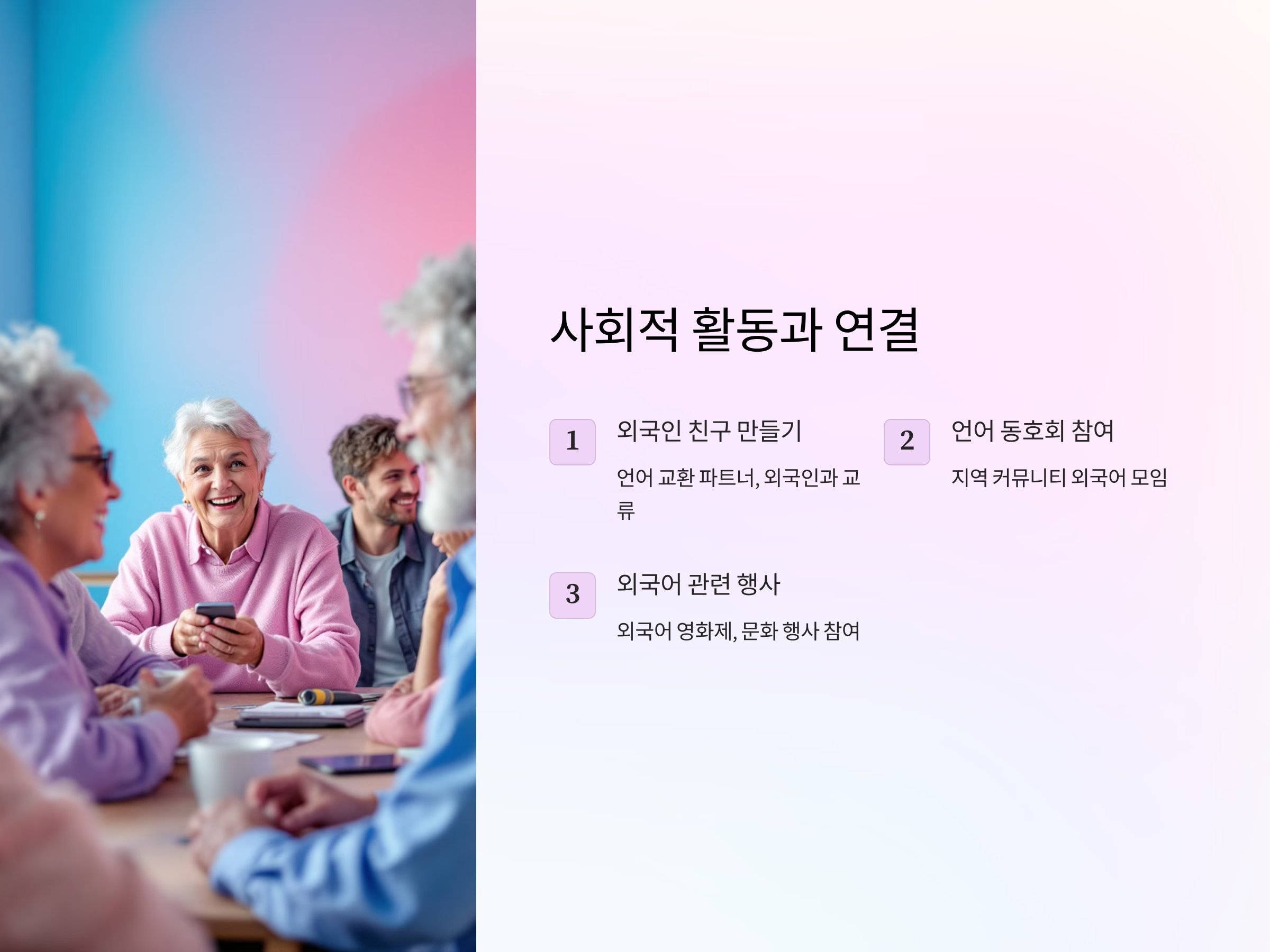 퇴직 후 외국어를 배우는 또 다른 큰 장점은 다양한 사회적 활동과 연결할 수 있다는 점입니다. 외국어를 배우면서 그 언어를 사용하는 사람들과의 사회적 네트워크를 만들 수 있습니다. 온라인이나 오프라인에서 다양한 커뮤니티에 참여하면, 언어 학습은 물론 새로운 인연도 만들 수 있습니다.