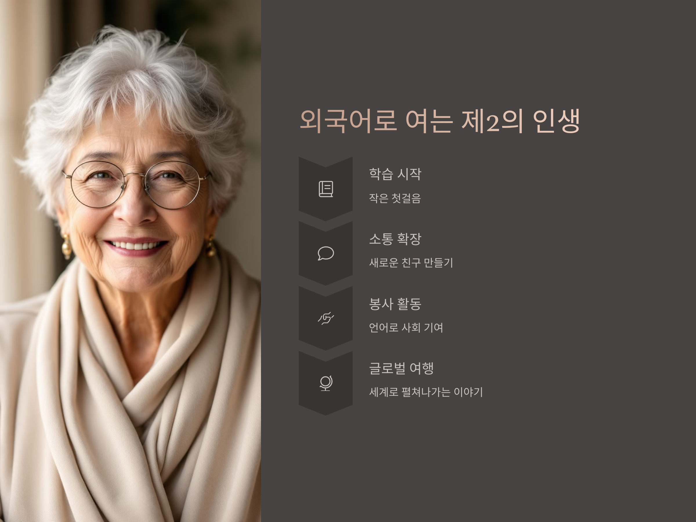 지금 시작해도 늦지 않았습니다. 외국어 학습은 단순한 언어 능력 향상이 아니라, 인생의 또 다른 도약을 위한 준비입니다. 새로운 친구, 문화, 일거리, 심지어는 인생의 사명까지도 외국어를 통해 만날 수 있습니다. 정년퇴직이라는 한 챕터가 끝났다면, 외국어는 새로운 챕터를 여는 최고의 열쇠가 될 수 있습니다.
