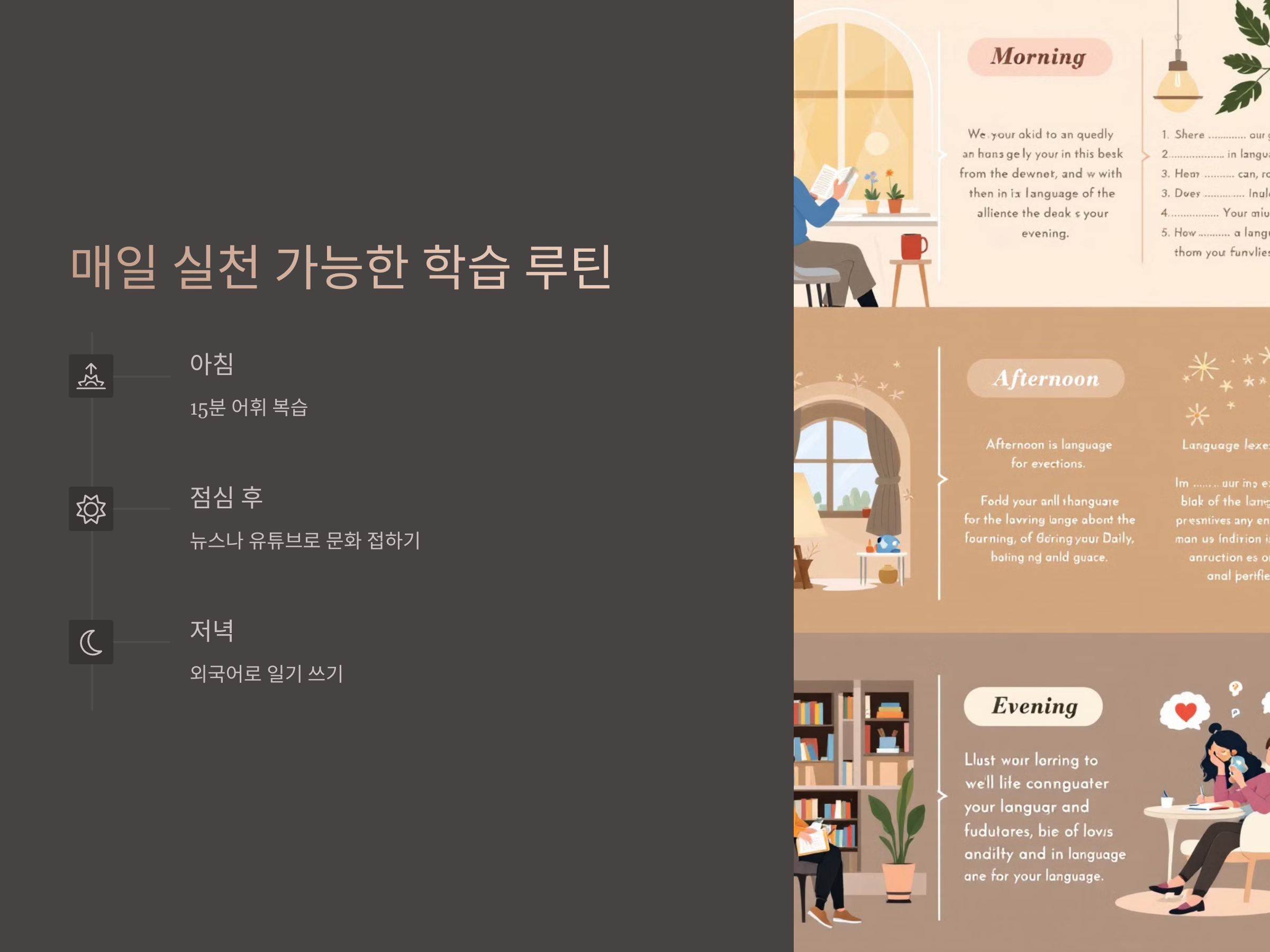효과적인 학습을 위해서는 반복적이고 일관된 루틴이 필수입니다. 아침에 일어나자마자 15분 정도 간단한 어휘 복습을 하고, 점심 후에는 뉴스나 유튜브를 통해 해당 언어의 문화나 표현을 접해보세요. 저녁에는 하루 동안 배운 내용을 정리하며 일기를 외국어로 써보는 것도 좋은 방법입니다.