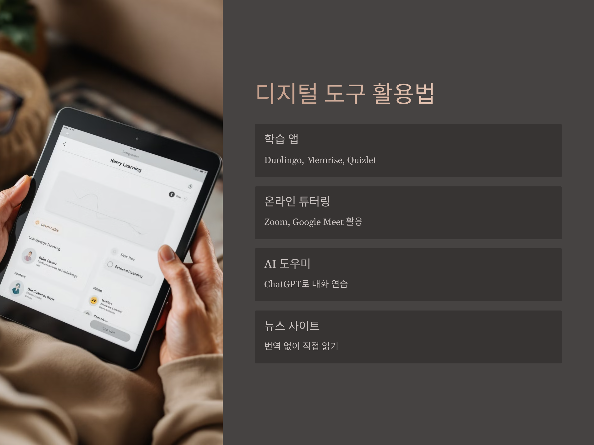 또한 Zoom, Google Meet 등을 활용한 1:1 온라인 튜터링은 회화 실력을 단기간에 끌어올리는 데 탁월합니다. AI 채팅도우미나 외국 뉴스 사이트를 번역 없이 직접 읽고 이해해보는 것도 훌륭한 자가 진단 학습법입니다.