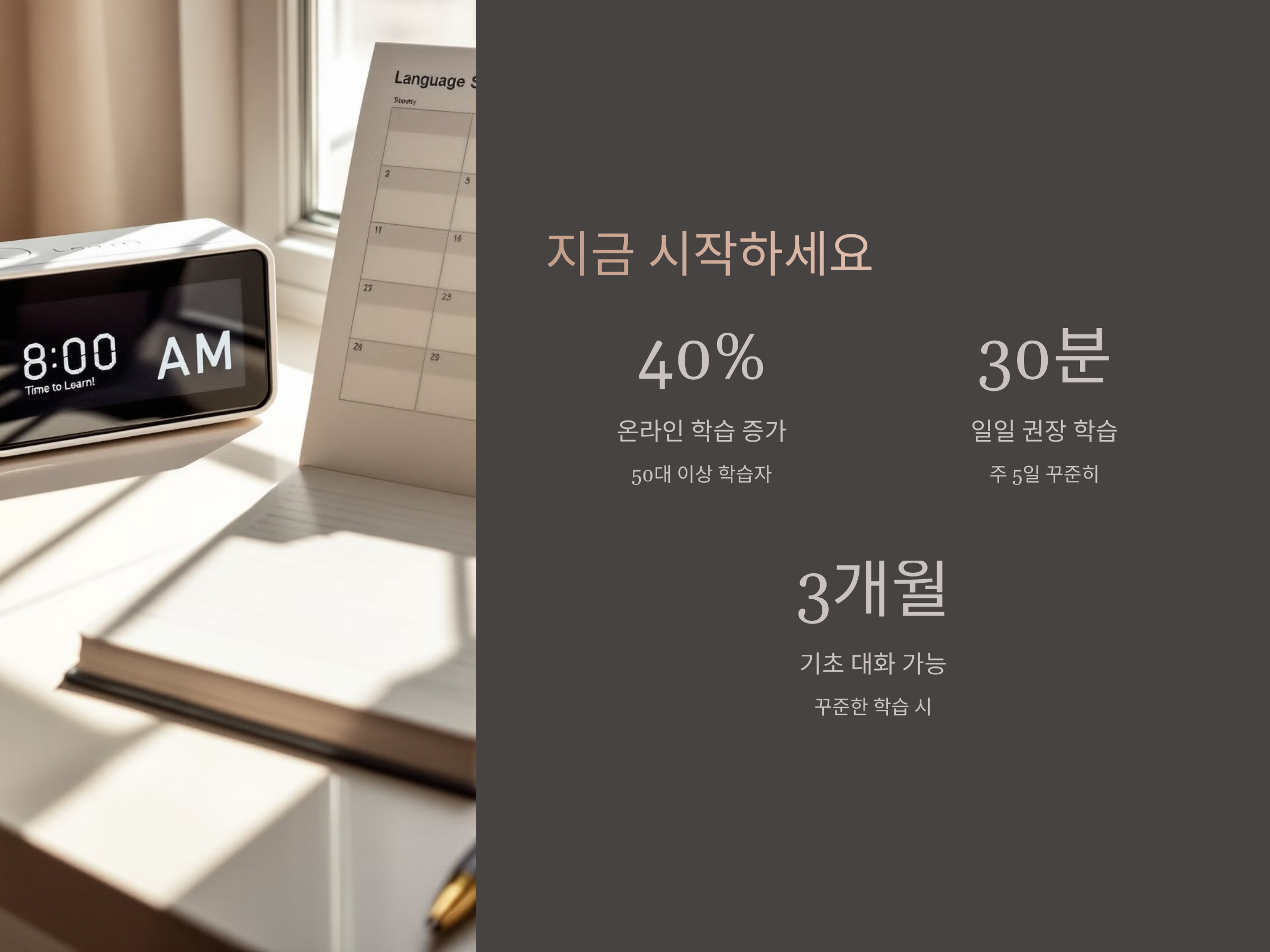 더 나아가 배운 언어로 사회봉사를 하거나, 글로벌 여행길에 오르며 자신의 이야기를 세계로 펼쳐나가 보세요. 지금 이 순간부터라도 작게 시작하면, 몇 개월 후 여러분은 상상도 못 했던 언어의 세계를 경험하게 될 것입니다.