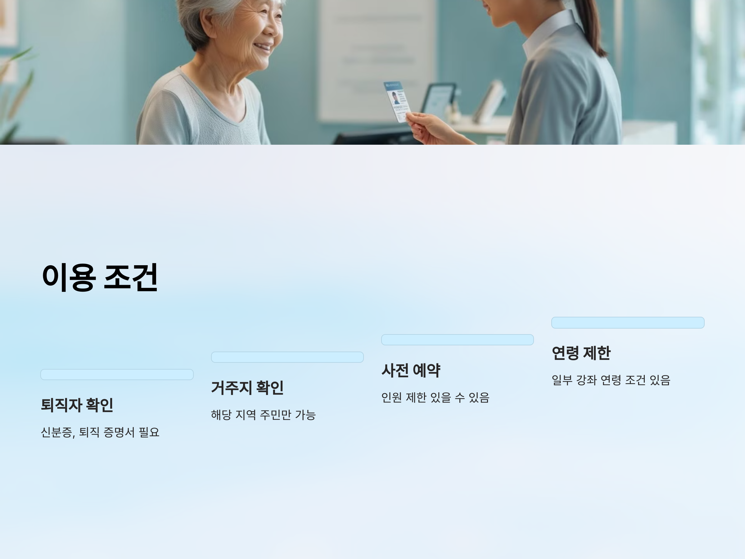 - 운동 강좌 수강 조건: 일부 체육관은 운동 강좌에 참여하려면 일정한 조건을 충족해야 할 수 있습니다. 예를 들어, 일정 연령 이상의 퇴직자가 해당될 수 있습니다.