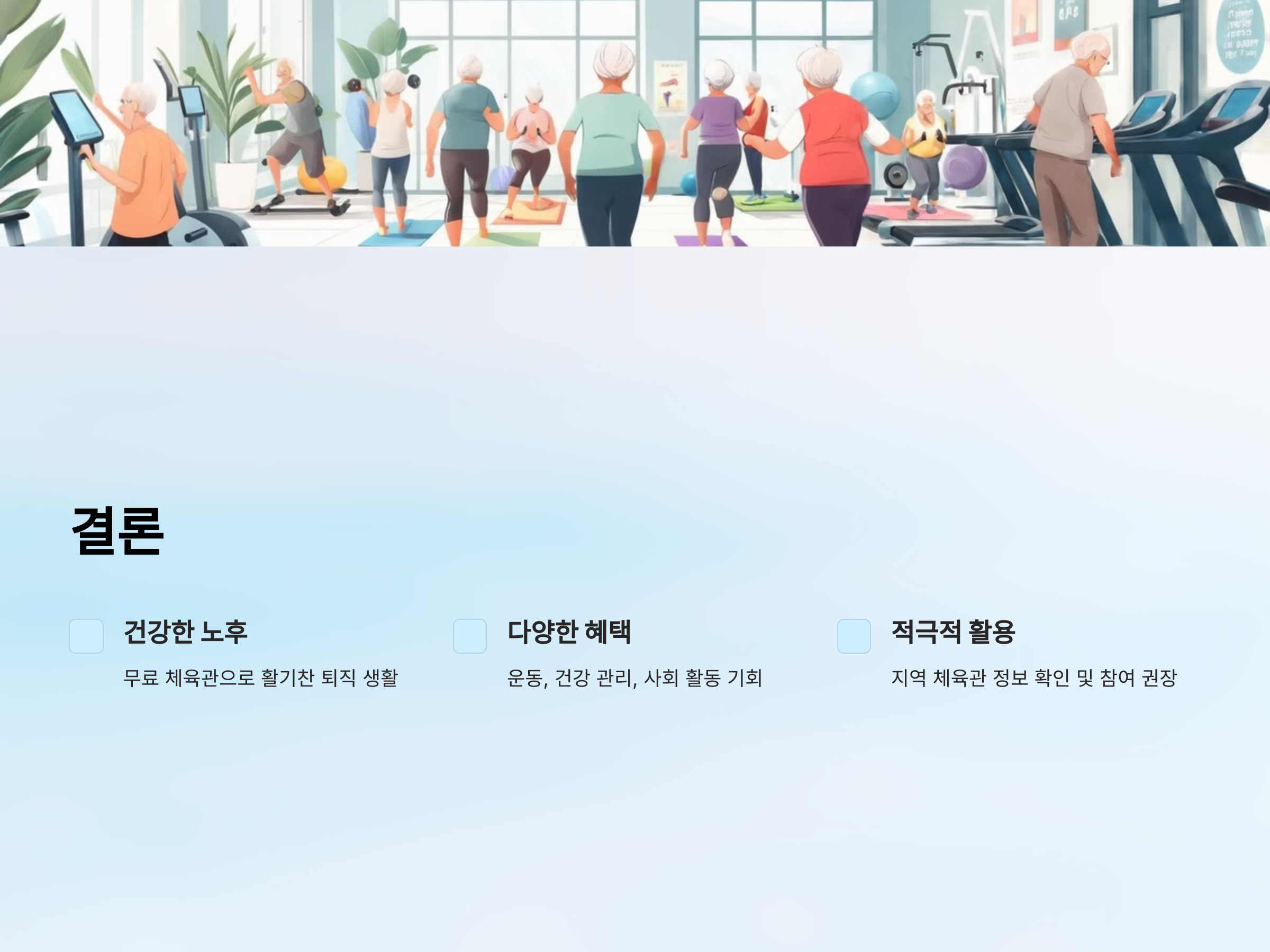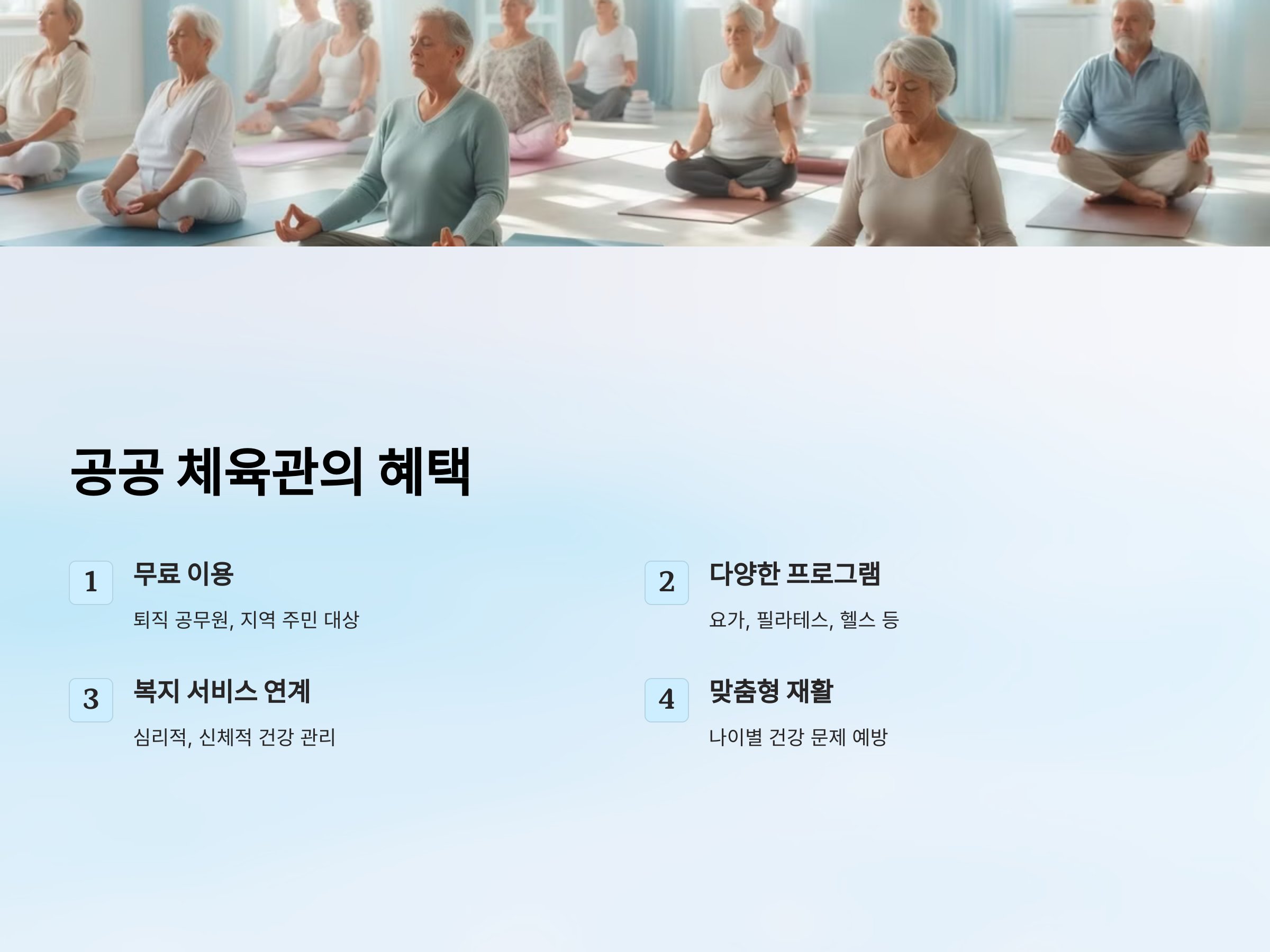 퇴직 후에도 꾸준히 운동하며 건강한 삶을 유지할 수 있는 방법은 바로 공공 체육관 이용입니다. 여러분도 가까운 체육관에서 제공하는 무료 혜택을 누리며 건강을 챙기시기 바랍니다.