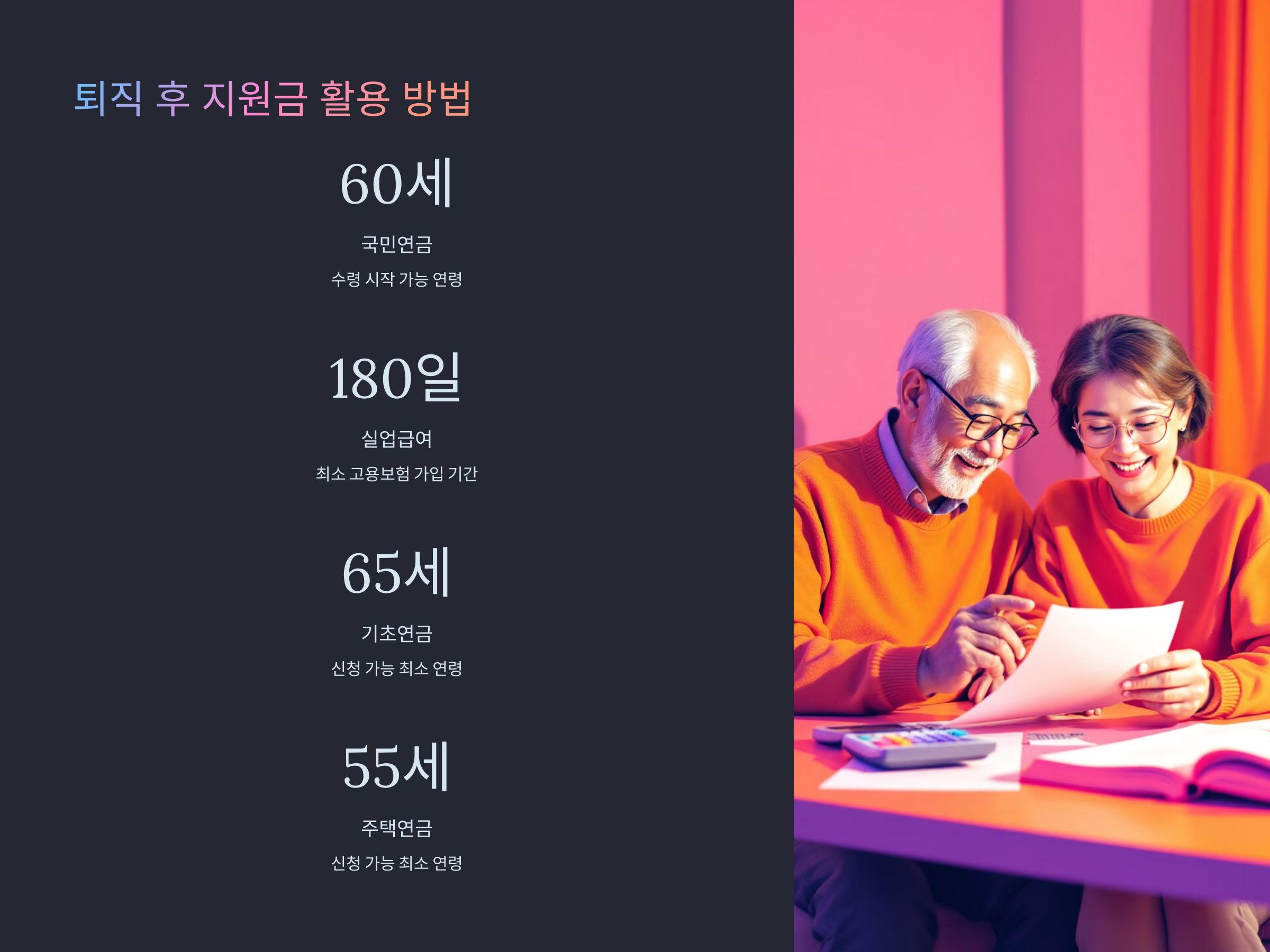 퇴직 후에도 이러한 다양한 지원금을 활용하여 안정적인 노후를 준비하시기 바랍니다. 각 지원금의 신청 조건과 절차를 미리 숙지하고, 필요한 서류를 준비하여 원활한 신청을 진행하시기 바랍니다.