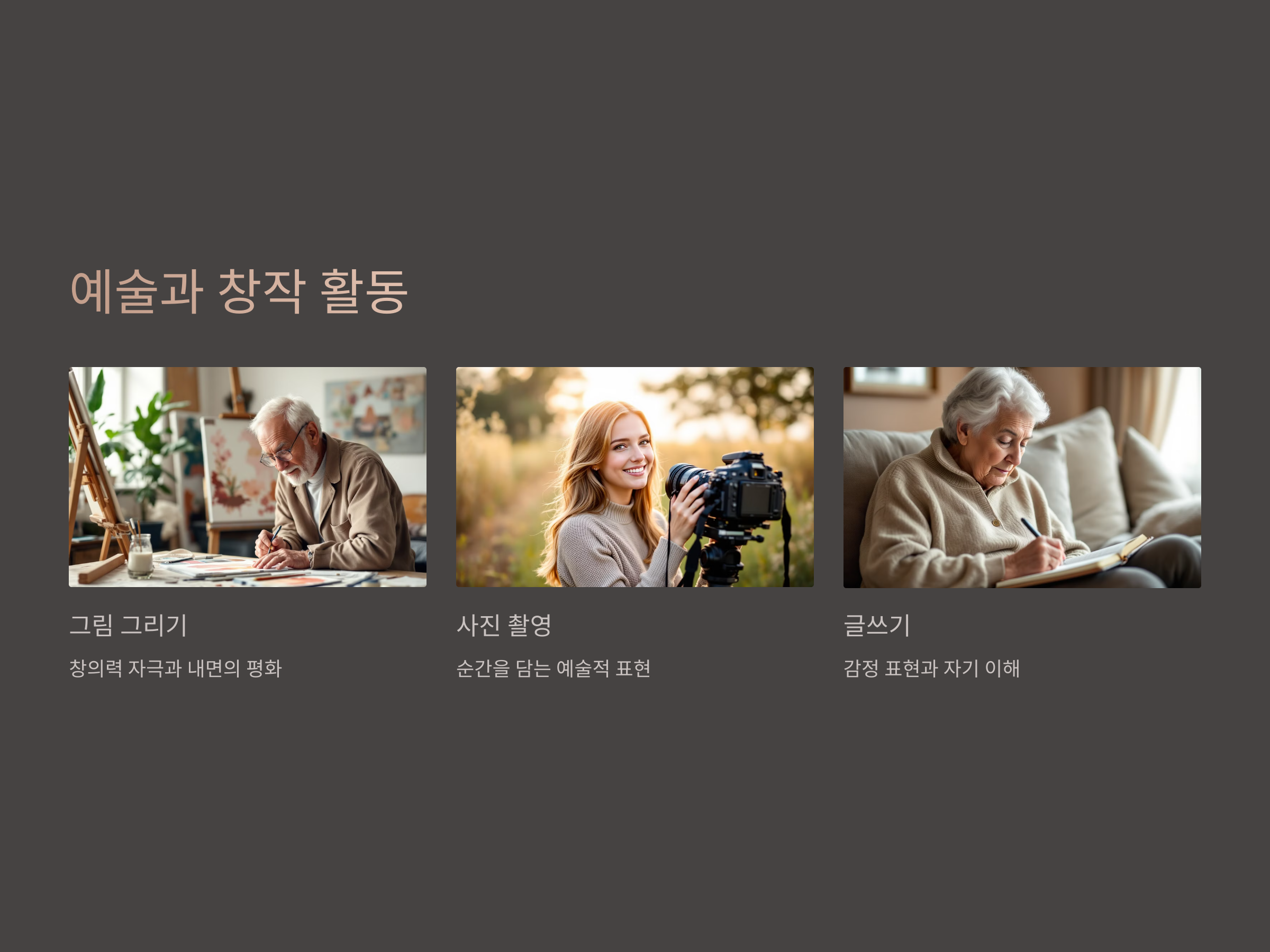 예술과 창작 활동은 퇴직 후에 가장 많이 선택되는 분야 중 하나입니다. 예술적인 취미는 마음의 안정과 창의력을 자극할 수 있는 좋은 방법입니다. 그림 그리기, 사진 촬영, 음악 연주, 글쓰기 등의 활동은 사람들에게 큰 기쁨을 주고, 때로는 전문적인 수준으로 발전할 수 있습니다. 특히, 그림이나 글쓰기는 독립적인 창작 활동을 통해 깊은 만족감을 얻을 수 있으며, 더 나아가 작품을 발표하거나 전시할 수 있는 기회가 될 수도 있습니다.