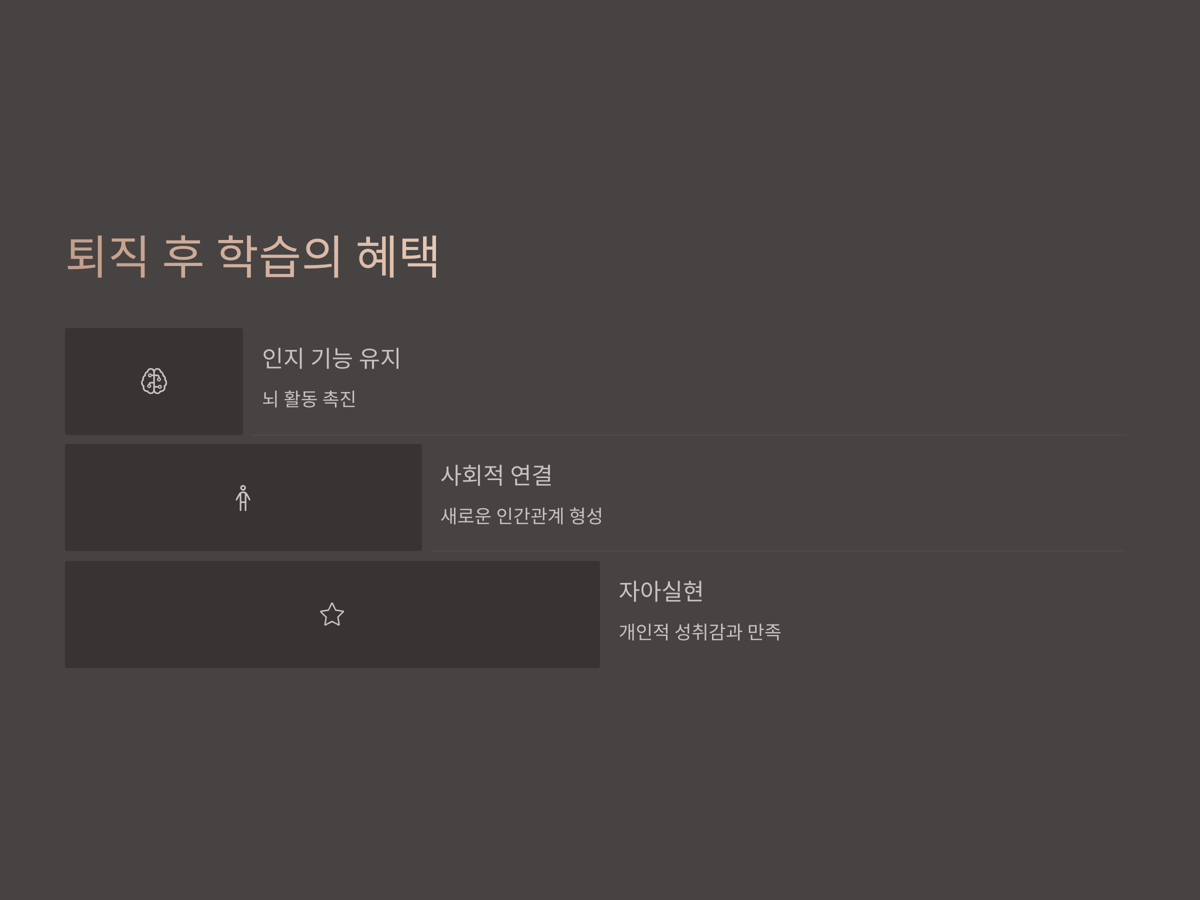 운동은 퇴직 후에도 매우 중요한 역할을 합니다. 나이가 들수록 근육량이 감소하고, 체력도 약해지기 때문에, 이를 예방하기 위해 꾸준한 운동이 필요합니다. 또한, 운동은 심리적으로도 긍정적인 영향을 미칩니다. 엔돌핀 분비로 인해 스트레스가 감소하고, 기분이 좋아지며, 전반적인 삶의 질을 향상시킬 수 있습니다. 운동을 통해 새로운 사람들과의 교류가 생기거나, 사회적 활동이 늘어날 수 있는 기회를 제공받을 수도 있습니다.