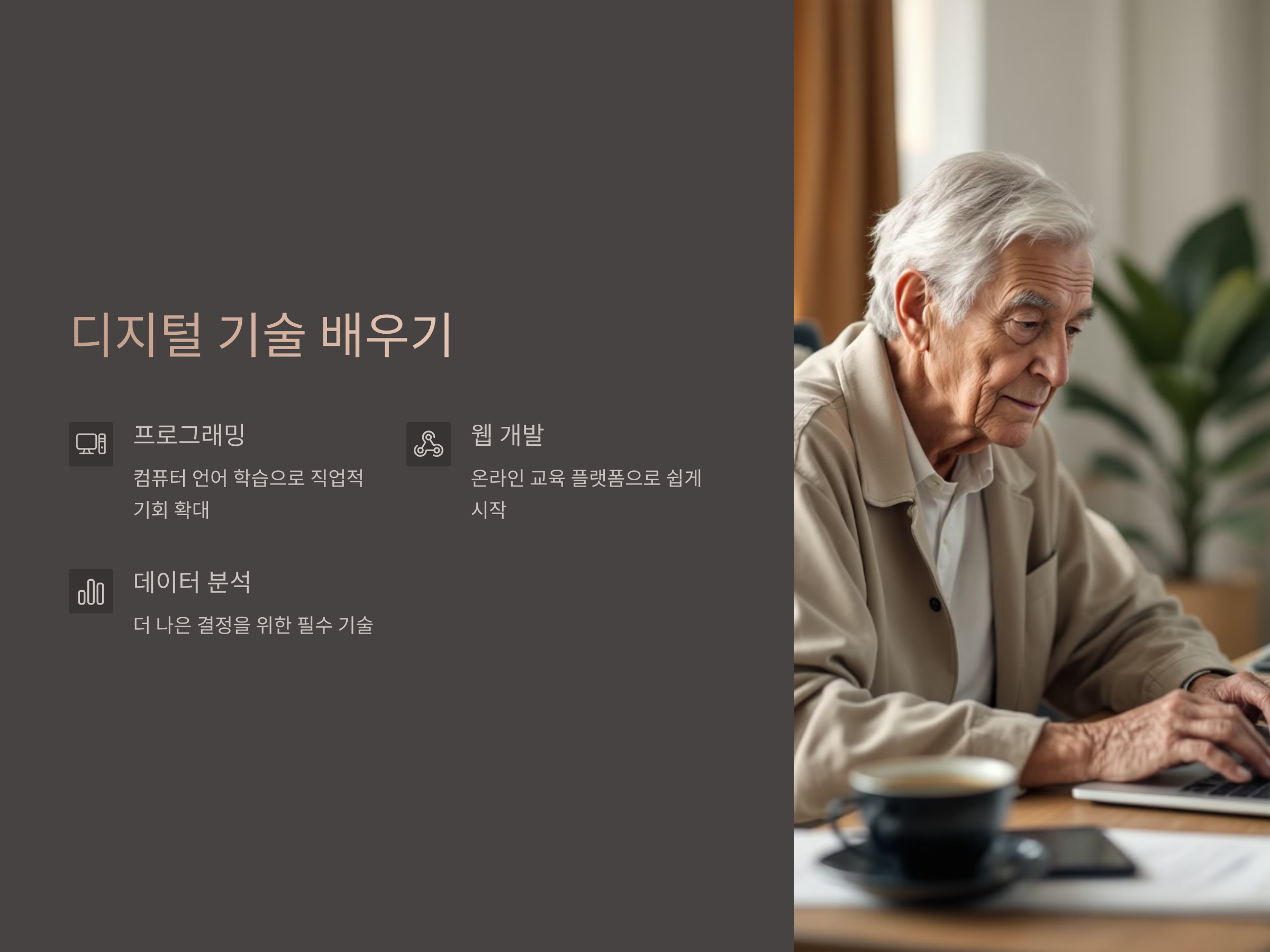 퇴직 후 가장 인기 있는 학습 분야 중 하나는 디지털 기술입니다. 디지털 기술은 다양한 직업에 적용 가능하고, 직업적 요구뿐만 아니라 일상생활에서도 유용합니다. 예를 들어, 컴퓨터 프로그래밍, 웹 개발, 데이터 분석, 그리고 디지털 마케팅 등은 모두 높은 수요를 자랑하는 분야입니다. 특히, 컴퓨터 언어를 배우는 것은 직업적으로나 개인적으로 매우 유익한 선택이 될 수 있습니다. 최근에는 온라인 교육 플랫폼을 통해 누구나 쉽게 시작할 수 있는 기회를 제공받고 있습니다. 무료와 유료 강좌들이 다양하게 존재하기 때문에 자신에게 맞는 프로그램을 선택하여 학습을 시작할 수 있습니다.