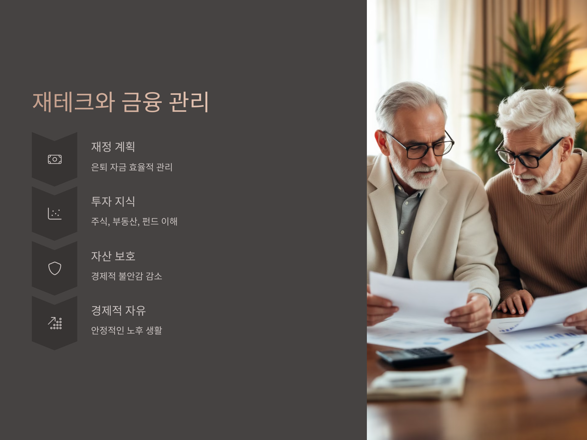 퇴직 후 재정적인 계획은 매우 중요합니다. 재정적으로 안정된 삶을 위해서는 효과적인 자산 관리와 재테크가 필요합니다. 퇴직 후 재정 관리 방법에 대한 교육을 받으면, 은퇴 자금을 잘 운용할 수 있고, 경제적으로 독립적인 생활을 유지할 수 있습니다. 온라인에서 다양한 재테크 강의를 듣고, 투자에 대한 지식을 쌓는 것이 중요합니다. 특히, 주식 투자, 부동산, 그리고 펀드 투자는 주요한 재테크 수단입니다.