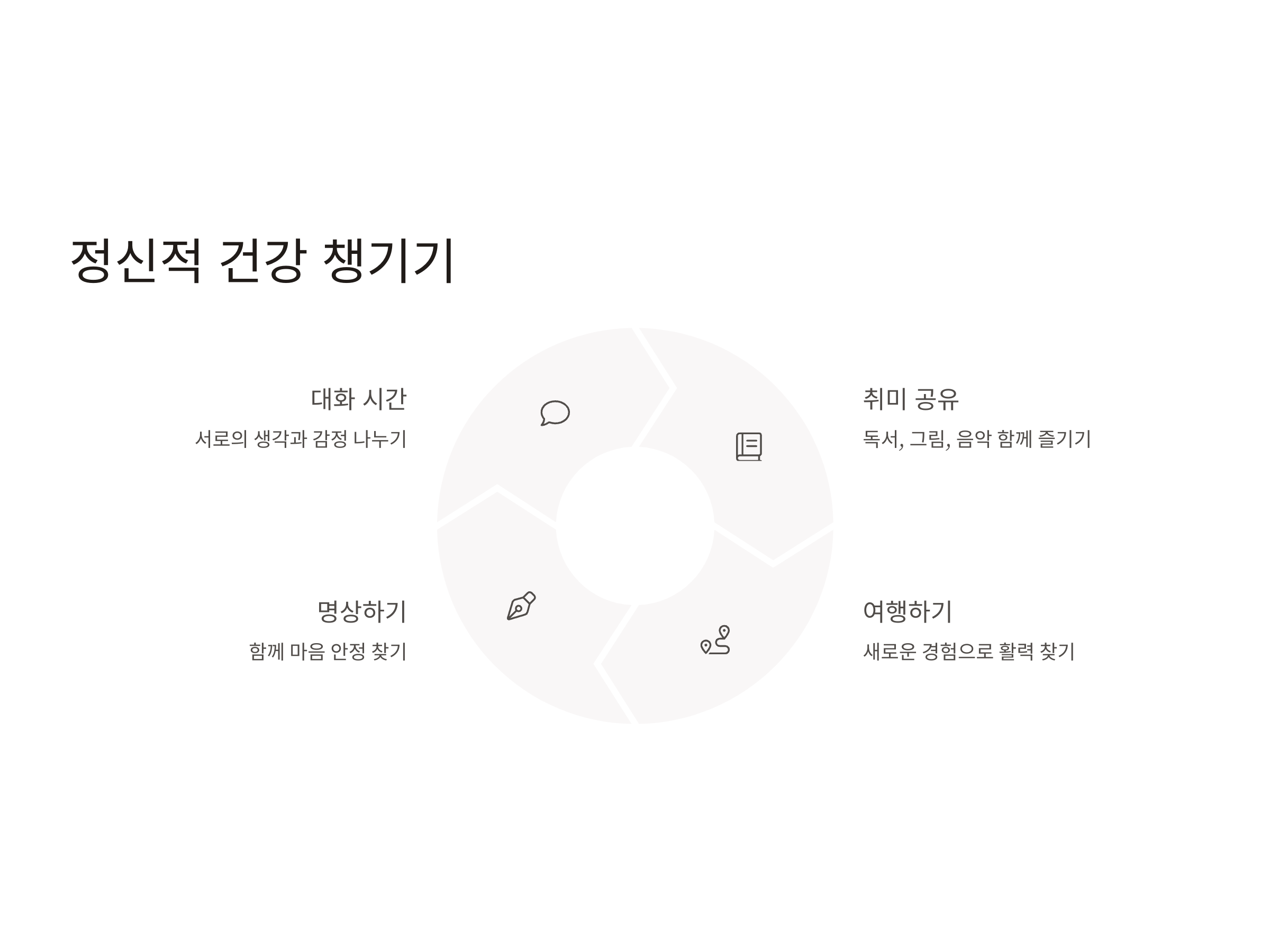 또한, 취미 생활을 함께 공유하는 것도 좋은 방법입니다. 독서, 그림 그리기, 여행, 음악 듣기 등 부부가 함께 즐길 수 있는 활동을 찾아서 참여해 보세요. 이렇게 서로의 취미를 공유하는 것은 관계를 더욱 깊게 하고, 정신적으로도 긍정적인 영향을 미칩니다.