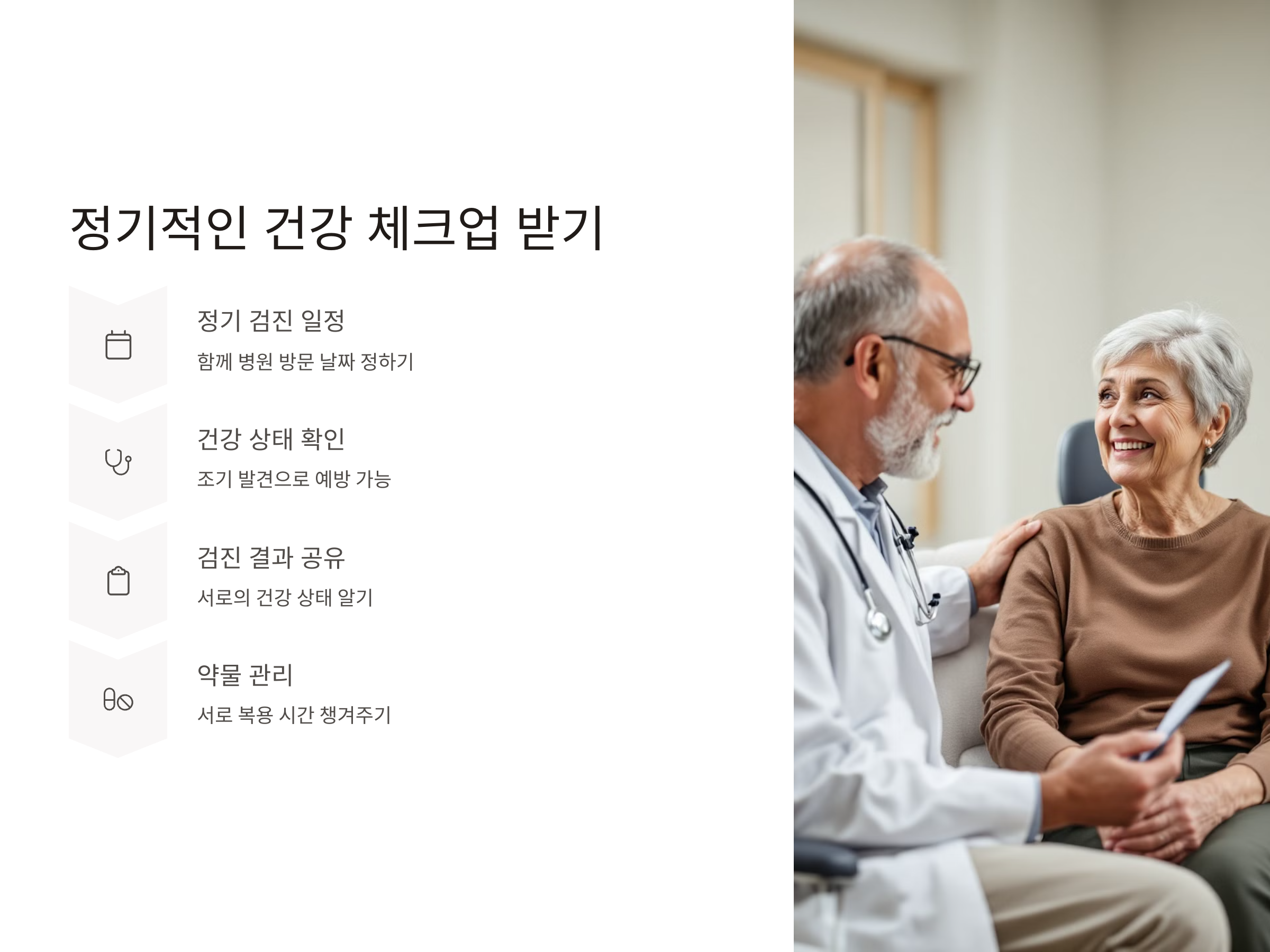 건강 검진을 통해 조기에 발견할 수 있는 질병들이 많기 때문에, 정기적으로 의사를 찾아 건강 상태를 체크하는 것이 필요합니다. 또한, 만약 병원이 멀리 있지 않다면, 운동 후 병원을 방문하여 상담을 받는 것도 좋습니다. 이렇게 부부가 함께 건강을 챙기는 모습은 서로에게 더 큰 동기부여가 될 것입니다.