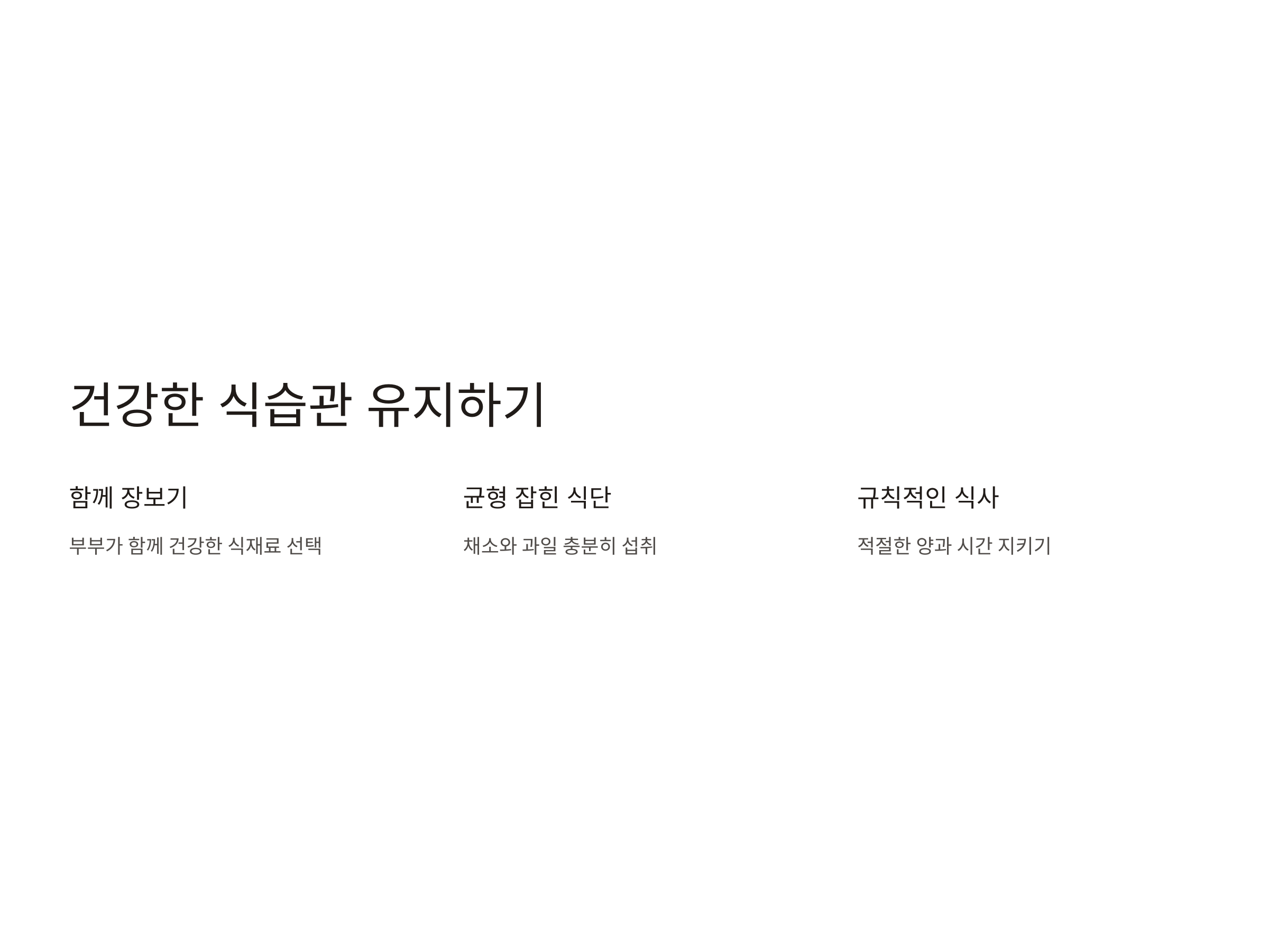 채소와 과일을 충분히 섭취하고, 불필요한 고지방, 고칼로리 음식을 피하는 것이 중요합니다. 또한, 규칙적인 식사 시간과 적절한 양의 식사를 지키는 것도 중요합니다. 부부가 함께 건강한 음식을 준비하고 서로의 건강을 챙기면서 더욱 건강한 생활을 유지할 수 있습니다.