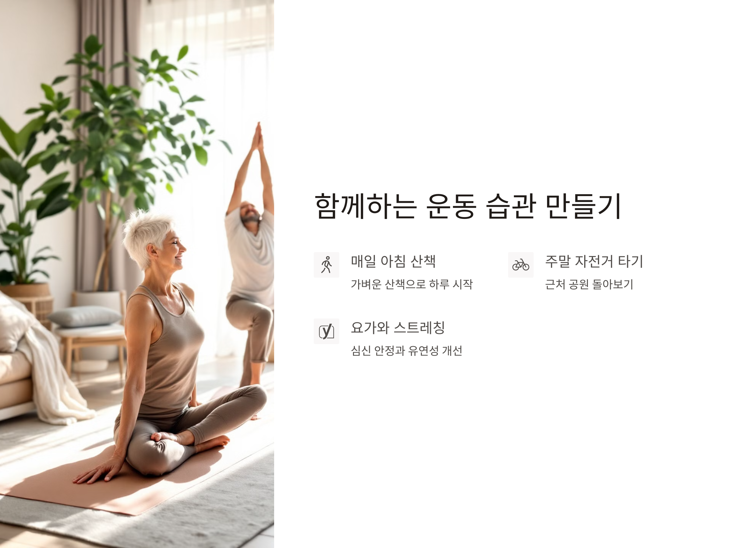 퇴직 후 시간이 많아지면 부부가 함께 운동을 하는 습관을 만드는 것이 매우 중요합니다. 부부가 함께 운동하면 서로 격려할 수 있고, 지속적인 운동을 통해 건강을 유지할 수 있습니다. 매일 아침 가벼운 산책을 하거나, 주말에는 자전거를 타고 근처 공원을 돌아보는 것도 좋은 방법입니다.