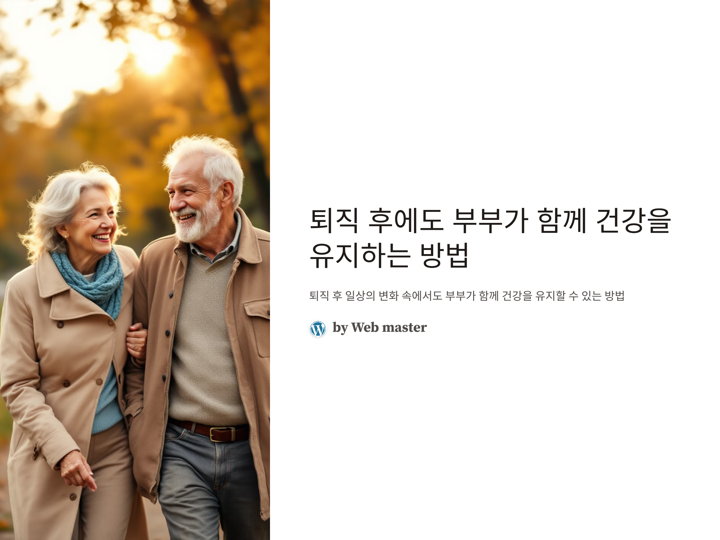 퇴직 후에는 시간이 많아져 부부가 함께 다양한 활동을 즐기면서 건강을 유지할 수 있는 기회가 많아집니다. 운동, 건강한 식습관, 정신적 건강, 정기적인 건강 체크업 등 부부가 함께 실천할 수 있는 방법은 많습니다. 중요한 것은 서로 협력하고, 서로의 동기를 부여하며, 지속적으로 건강한 생활을 유지하는 것입니다.