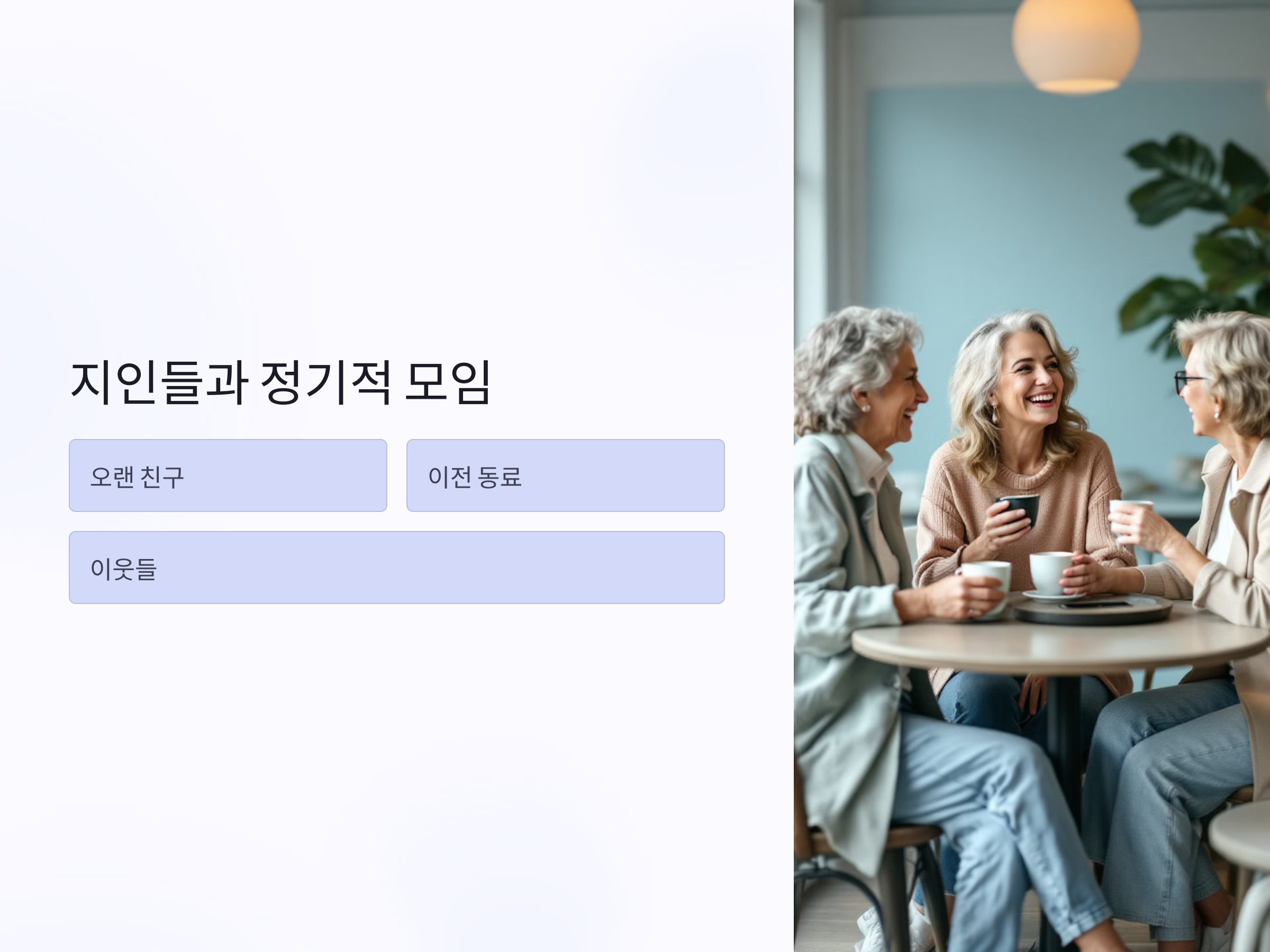 친구들, 이전 직장 동료들, 이웃들과의 관계를 꾸준히 유지하는 것은 중요한 사회적 연결망을 구축하는 데 도움이 됩니다. 정기적인 모임을 가지거나 카페에서 커피 한 잔을 나누는 간단한 만남도 퇴직 후의 외로움을 덜어줄 수 있습니다. 또한, 이런 모임은 삶의 활력소가 되어주며, 함께하는 시간을 통해 서로의 삶을 공유할 수 있는 기회를 제공합니다.