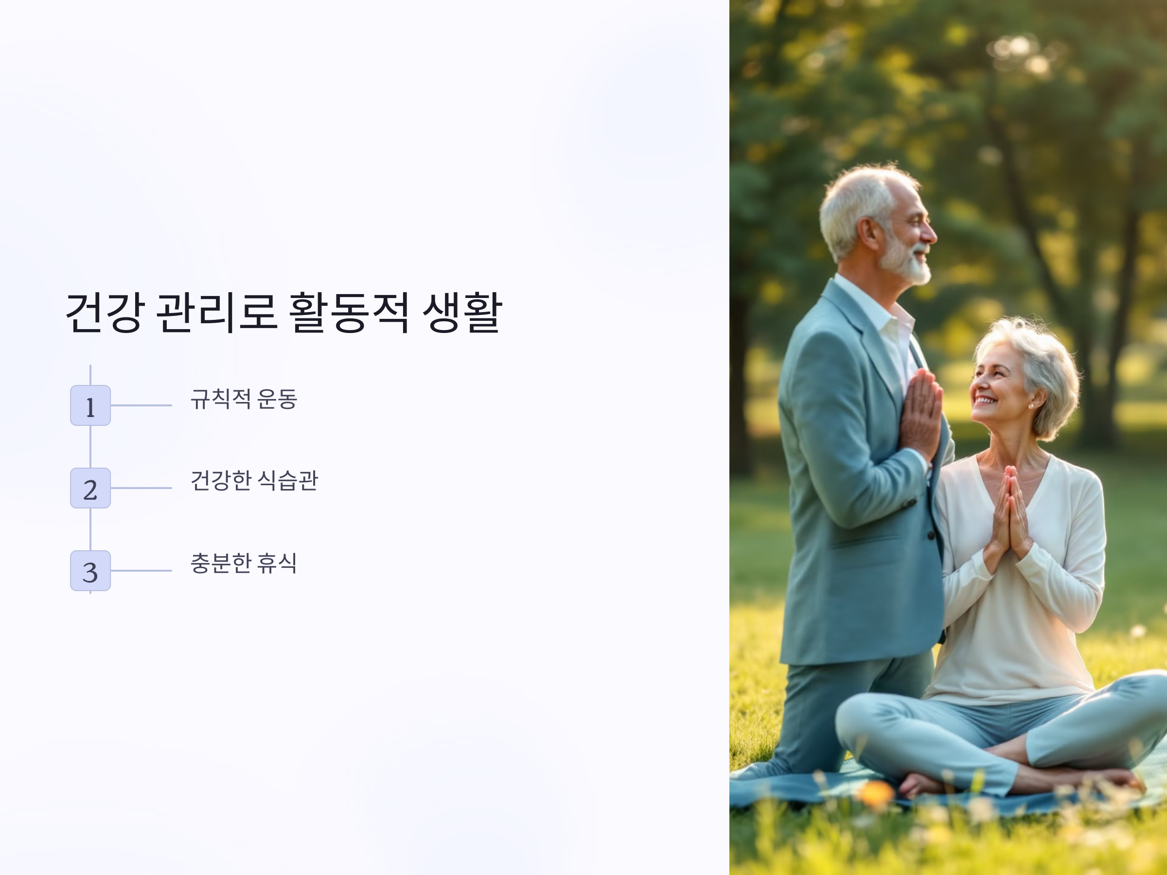 퇴직 후에도 사회생활을 즐기기 위해서는 건강을 유지하는 것이 중요합니다. 건강한 몸과 마음을 유지하면서 다양한 활동을 할 수 있어야 사회생활을 더욱 즐길 수 있기 때문입니다. 운동을 통해 몸을 건강하게 유지하고, 일상에서 규칙적인 생활을 하는 것이 중요합니다. 예를 들어, 아침마다 가벼운 산책을 하거나, 요가와 같은 운동을 정기적으로 하는 것이 좋습니다.
