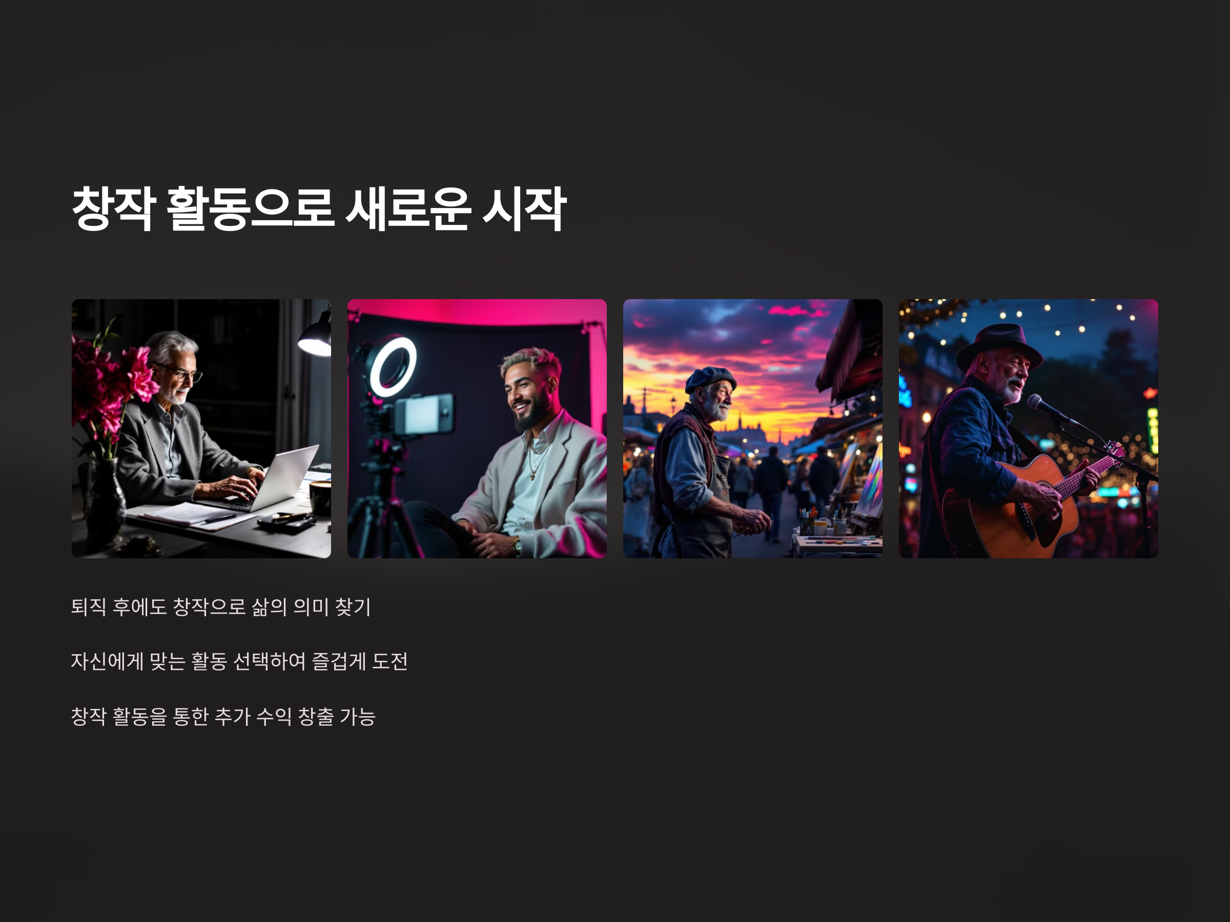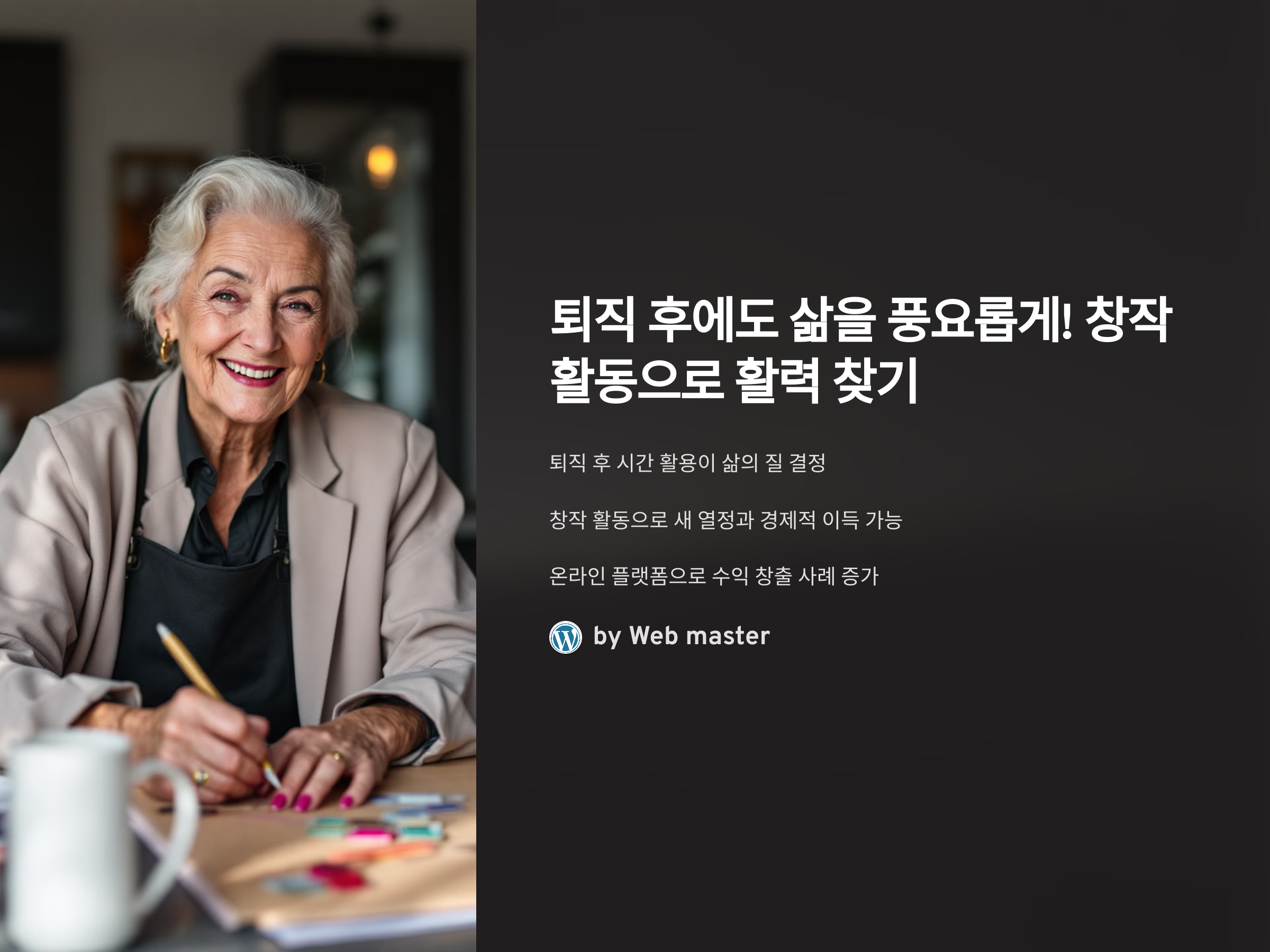 퇴직 후에도 창작 활동을 통해 삶의 의미를 찾고, 추가적인 수익까지 창출할 수 있습니다. 자신에게 맞는 활동을 선택하여 즐겁게 도전해 보세요!