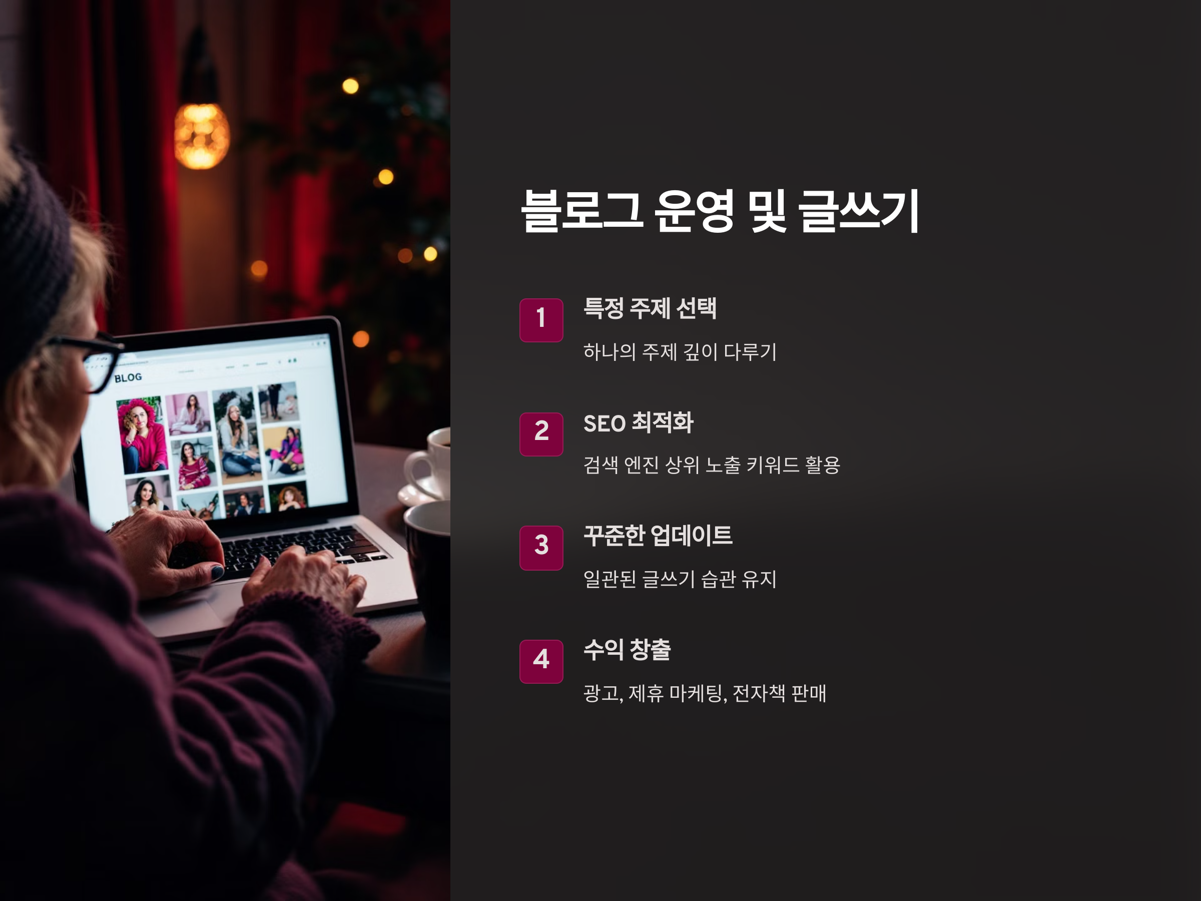 블로그 운영은 퇴직 후에도 꾸준히 할 수 있는 대표적인 창작 활동입니다. 관심 있는 주제나 퇴직 전 경험을 바탕으로 글을 쓰면, 많은 사람들에게 도움이 될 뿐만 아니라 광고 수익도 기대할 수 있습니다. 특히, 여행 후기, 재테크, 요리, 건강 관리 등은 인기 있는 주제입니다.