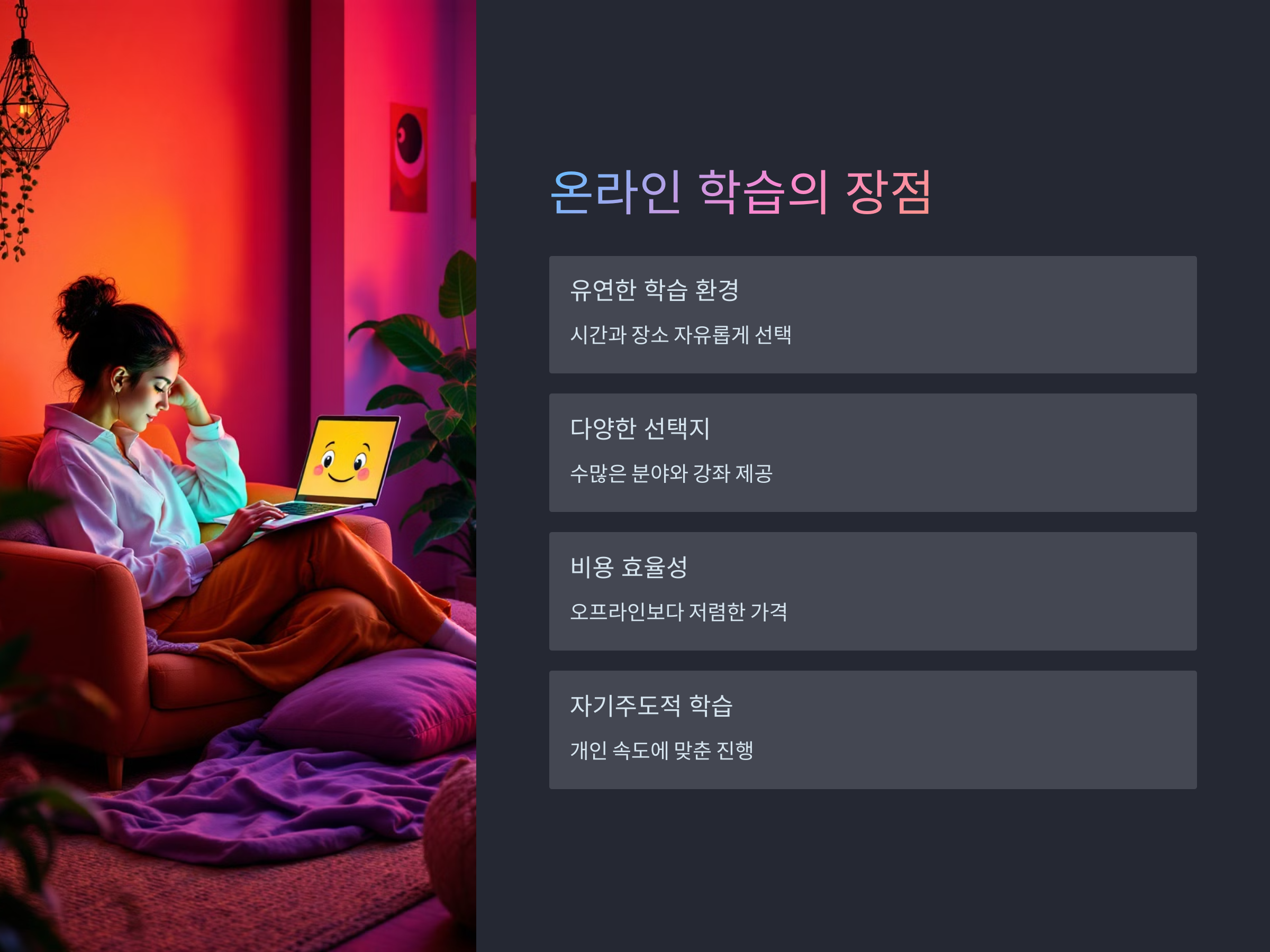 온라인 강좌를 통해 배울 수 있는 분야는 매우 다양합니다. 자격증을 취득하거나 새로운 직업을 준비하는 과정에서 많은 사람들이 온라인 학습을 통해 실력을 쌓고 있습니다.