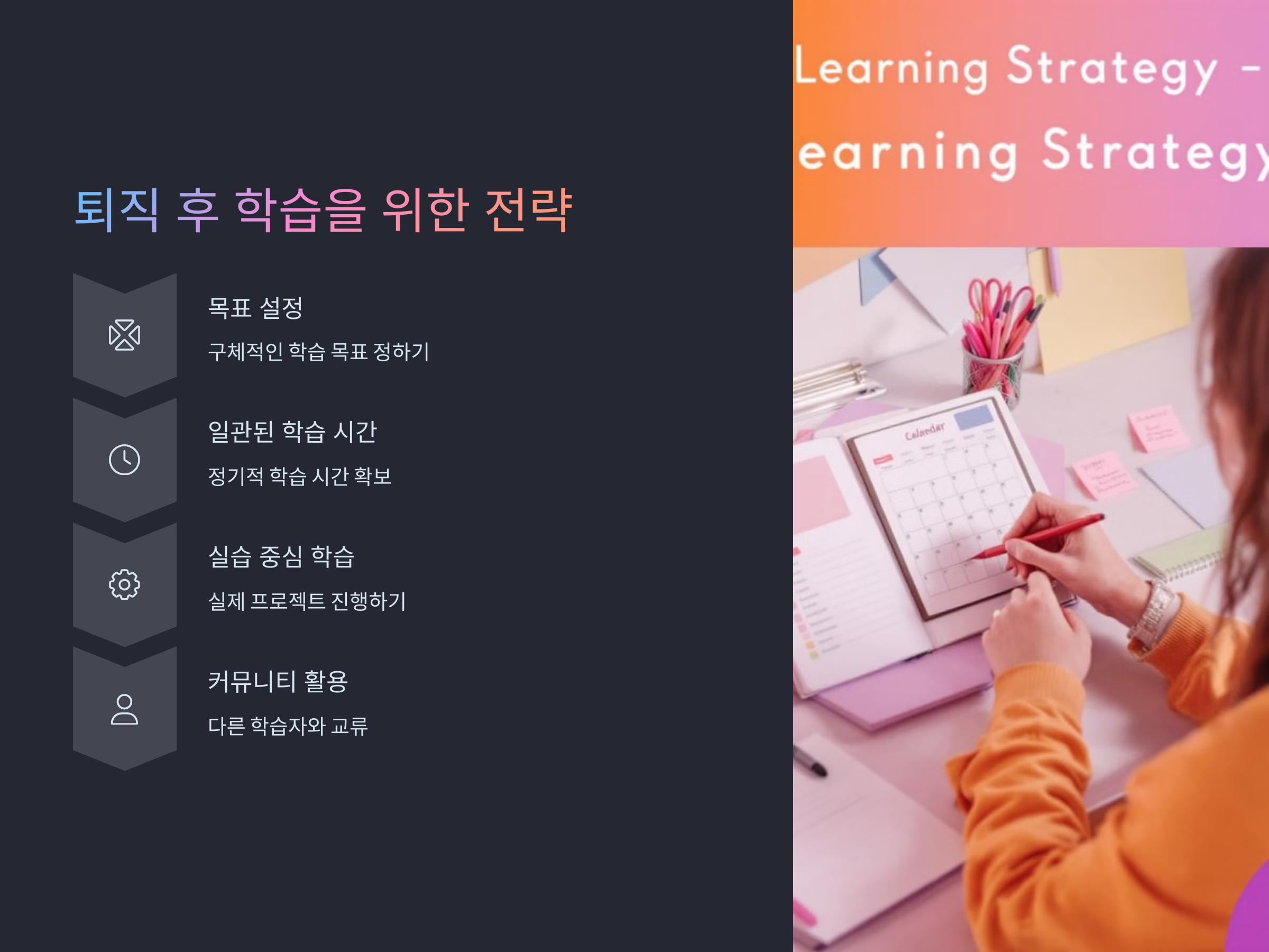 퇴직 후 시간은 상대적으로 자유롭지만, 학습을 위한 시간을 꾸준히 확보하는 것이 중요합니다. 매일 정해진 시간에 학습을 하거나, 주간 계획을 세워 주기적으로 학습할 수 있도록 해보세요.