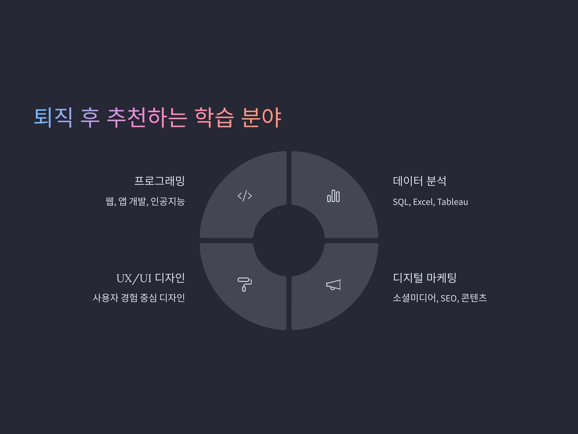 데이터 분석은 현재 거의 모든 산업에서 중요시되는 기술입니다. SQL, Excel, Tableau와 같은 데이터 분석 툴을 배우면, 다양한 분야에서 활용할 수 있습니다. 데이터를 분석하고, 예측하는 능력은 퇴직 후에도 새로운 직업을 찾는 데 매우 유리합니다.