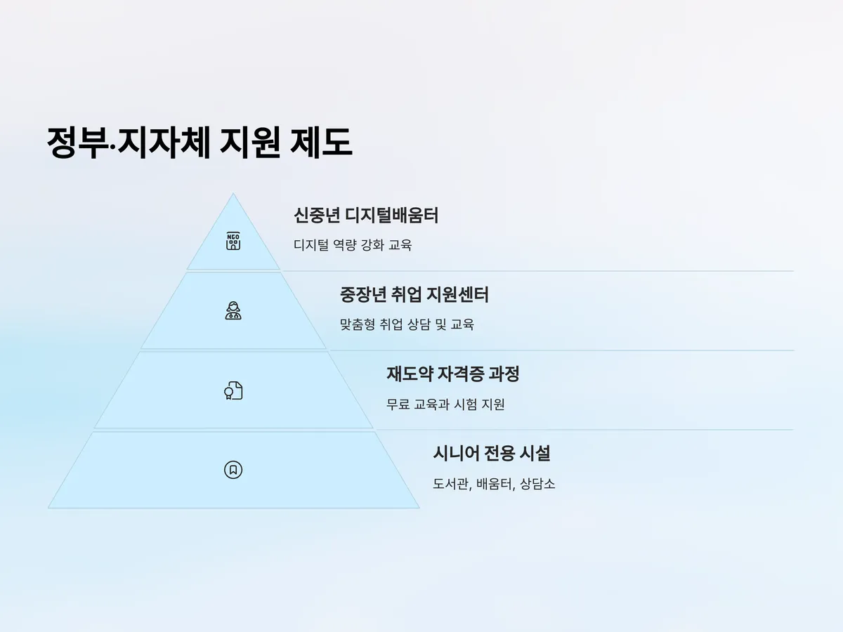 한국 정부는 퇴직자를 위한 평생학습 지원 정책을 확대하고 있습니다. 대표적으로 '신중년 디지털배움터', '중장년 취업 지원센터', '재도약 자격증 과정' 등이 있습니다. 지자체 평생학습관을 통해 무료로 수강할 수 있는 과정도 많고, 일부는 교재비나 자격시험 응시료까지 지원됩니다.