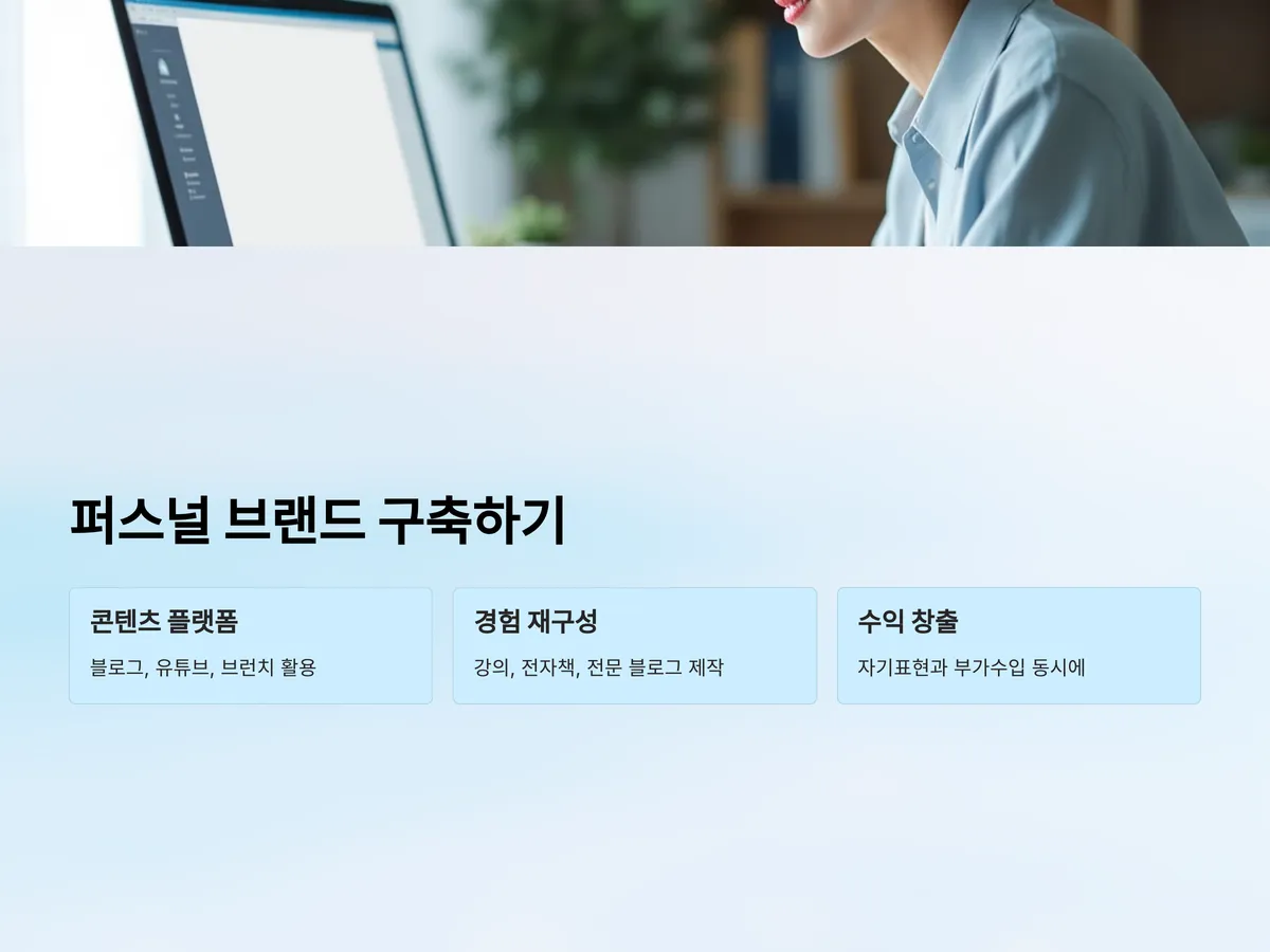 단순한 재취업보다 더 주목받는 개념은 퍼스널 브랜드 구축입니다. 블로그, 유튜브, 브런치 등의 플랫폼을 통해 자신만의 지식과 경험을 콘텐츠로 발신하면서 새로운 기회를 창출할 수 있습니다. 이는 직장이라는 틀을 벗어나 자신이 중심이 되는 삶을 만들어가는 방식입니다.