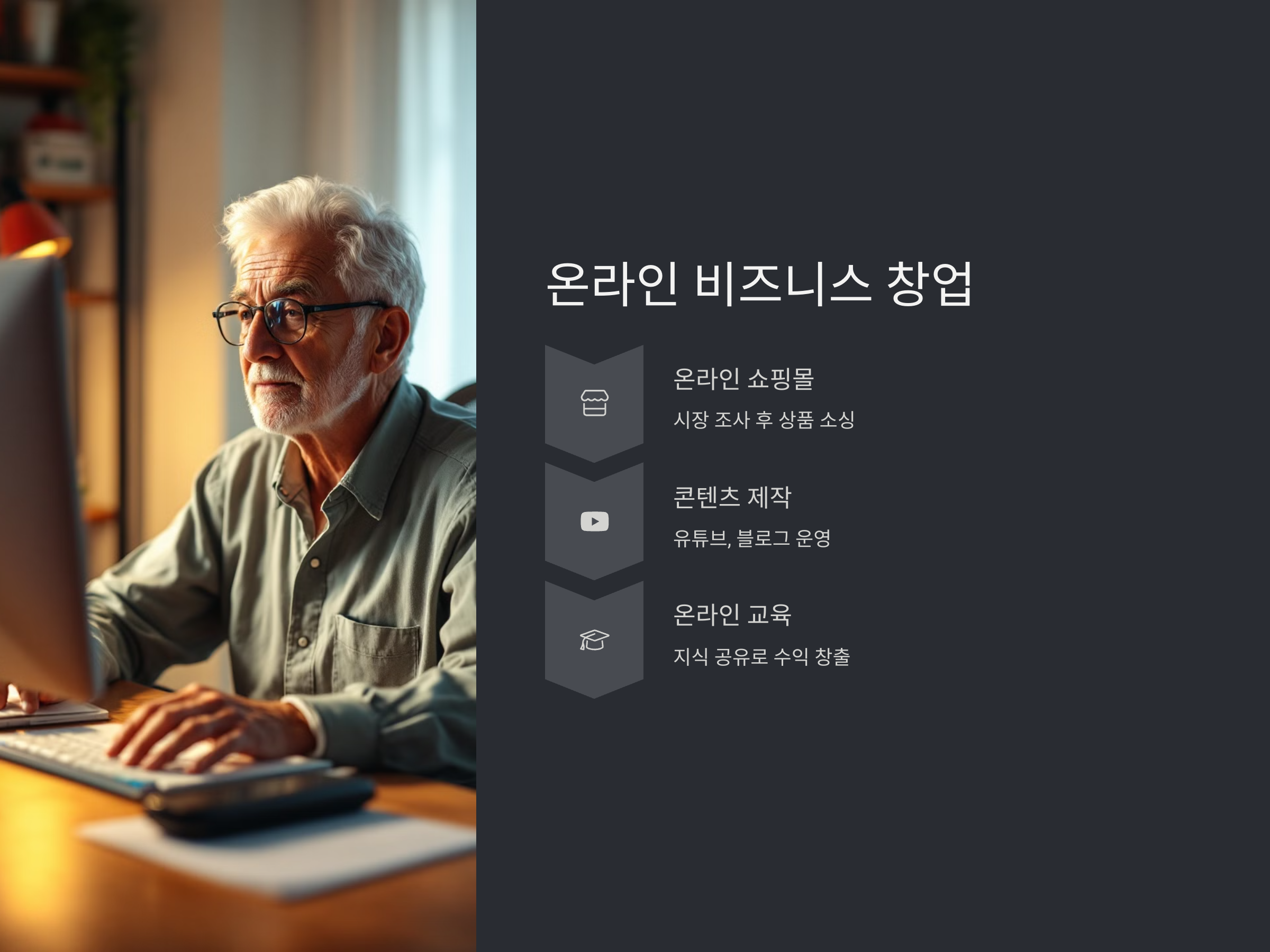 퇴직 후에는 안정적인 소득을 유지하기 위해 온라인 비즈니스를 시작하는 것도 좋은 방법입니다. 인터넷을 통해 상품을 판매하거나, 온라인 교육을 제공하는 등 다양한 형태의 비즈니스 모델을 고려할 수 있습니다. 특히 최근에는 온라인 쇼핑몰, 블로그 운영, 유튜브 채널 운영, 디지털 상품 판매 등이 인기를 끌고 있습니다. 이러한 온라인 비즈니스는 초기 투자 비용이 낮고, 일정한 수익을 올릴 수 있는 잠재력을 가지고 있습니다.