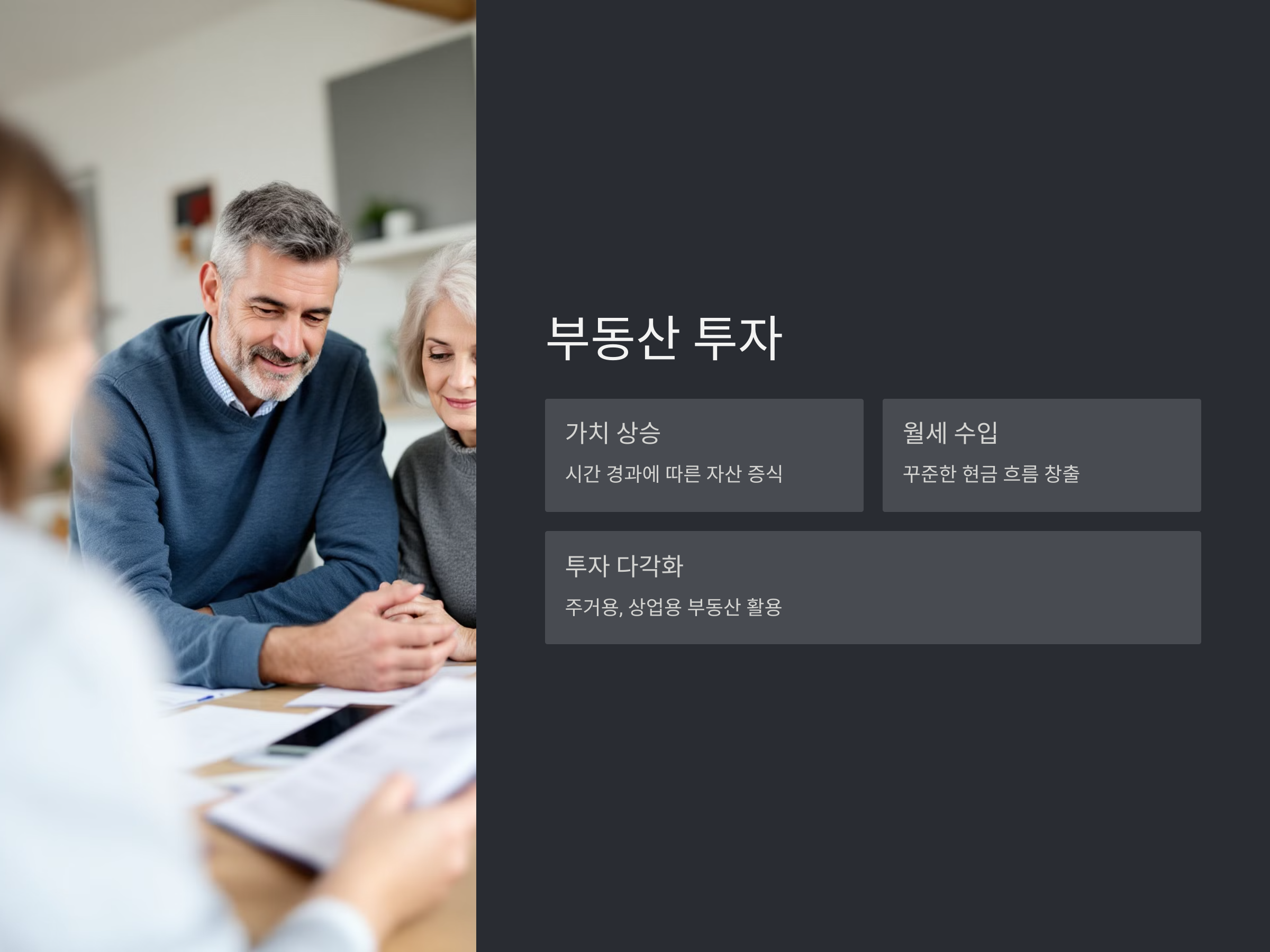 부동산 투자는 퇴직 후에도 안정적인 소득을 유지할 수 있는 방법 중 하나입니다. 부동산은 시간이 지나면서 가치가 상승하고, 월세 수입을 통해 꾸준한 현금 흐름을 만들어낼 수 있습니다. 물론 초기 투자금이 상당히 필요하지만, 잘 관리된 부동산은 퇴직 후에도 안정적인 수익을 제공할 수 있습니다.