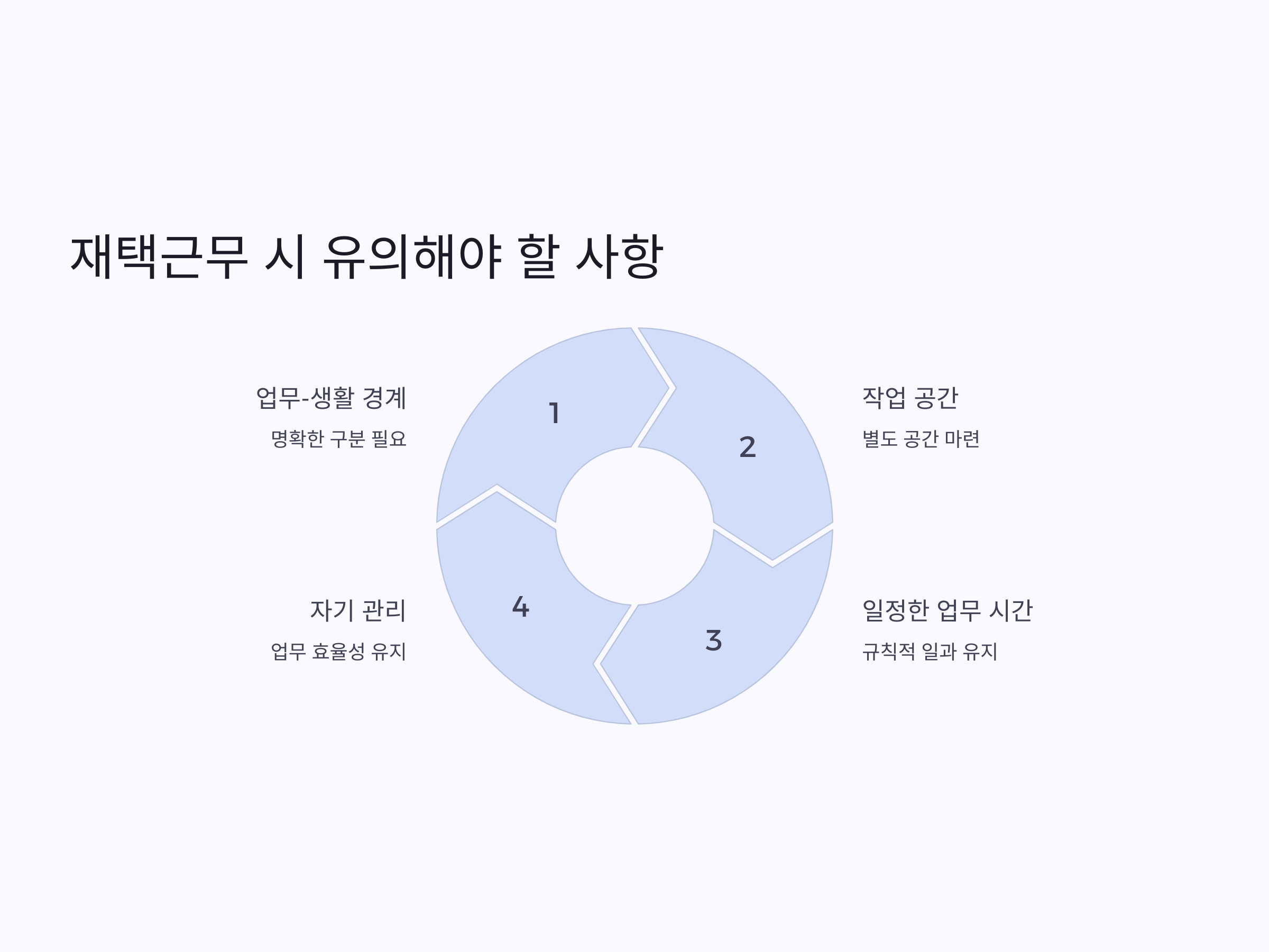 재택근무를 할 때에는 몇 가지 유의해야 할 사항이 있습니다. 우선, 업무와 개인 생활의 경계를 명확히 구분하는 것이 중요합니다. 이를 위해 작업 공간을 따로 마련하고, 일정한 업무 시간을 지키는 것이 도움이 됩니다. 또한, 자기 관리를 통해 업무 효율성을 유지하는 것이 필요합니다.
