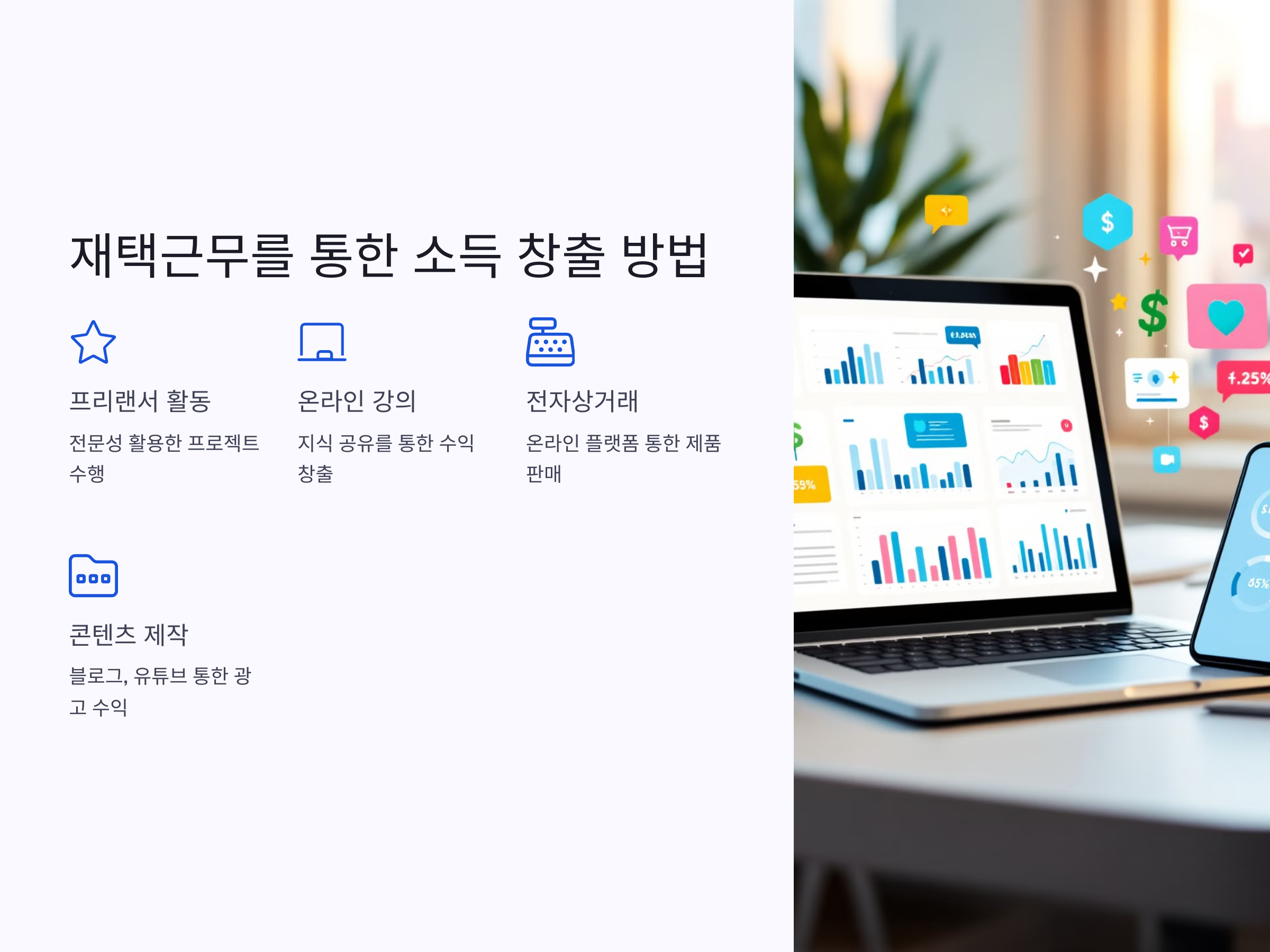 재택근무를 통해 소득을 창출할 수 있는 다양한 방법이 존재합니다. 예를 들어, 프리랜서로서 자신의 전문성을 활용하여 프로젝트를 수행하거나, 온라인 강의를 통해 지식을 공유할 수 있습니다. 또한, 전자상거래 플랫폼을 활용하여 제품을 판매하거나, 블로그나 유튜브와 같은 콘텐츠 제작을 통해 광고 수익을 얻을 수도 있습니다.