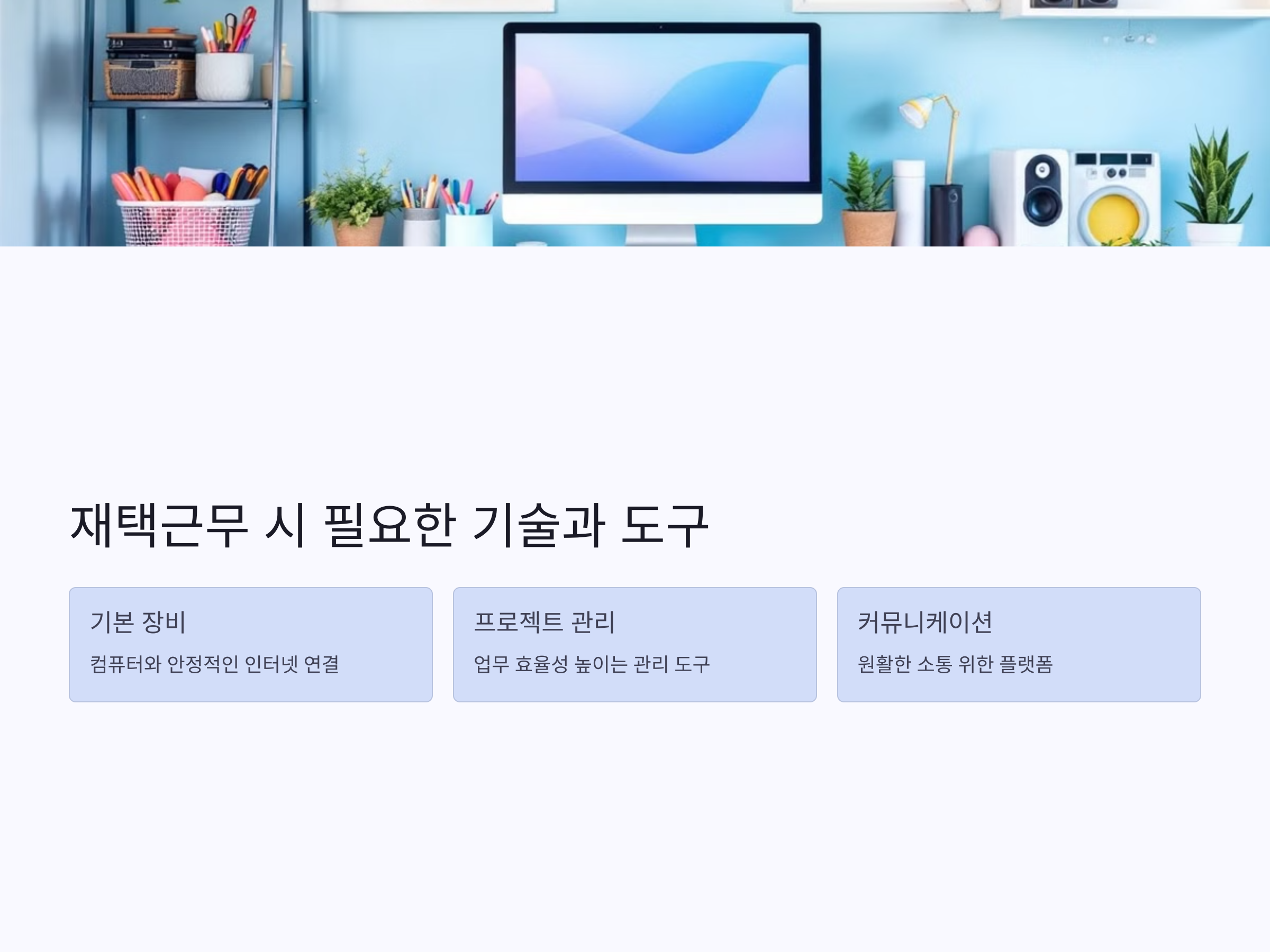 성공적인 재택근무를 위해서는 몇 가지 필수적인 기술과 도구가 필요합니다. 우선, 컴퓨터와 안정적인 인터넷 연결은 기본입니다. 또한, 프로젝트 관리 도구나 커뮤니케이션 플랫폼을 활용하여 업무 효율성을 높일 수 있습니다. 이러한 도구들을 적절히 활용하면 재택근무 환경을 더욱 효과적으로 구축할 수 있습니다.