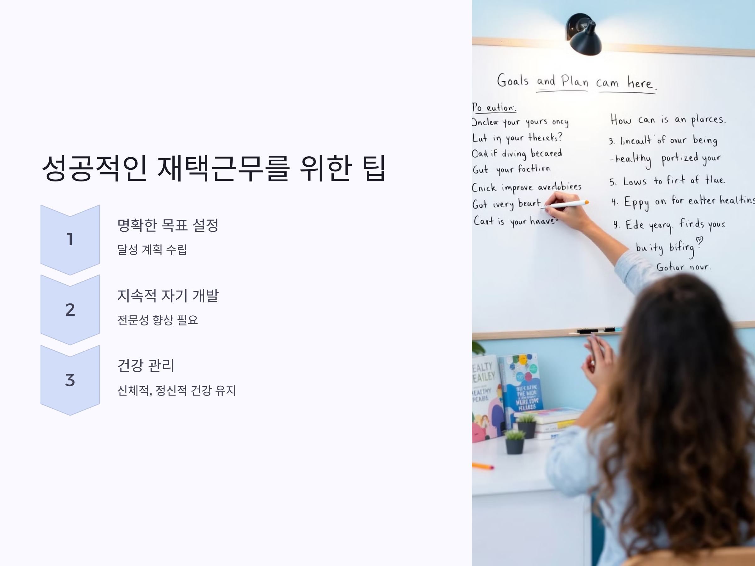 성공적인 재택근무를 위해서는 자기 관리와 동기 부여가 중요합니다. 우선, 명확한 목표를 설정하고 이를 달성하기 위한 계획을 수립해야 합니다. 또한, 지속적인 자기 개발을 통해 전문성을 향상시키는 것이 필요합니다. 마지막으로, 건강 관리를 통해 신체적, 정신적 건강을 유지하는 것이 중요합니다.