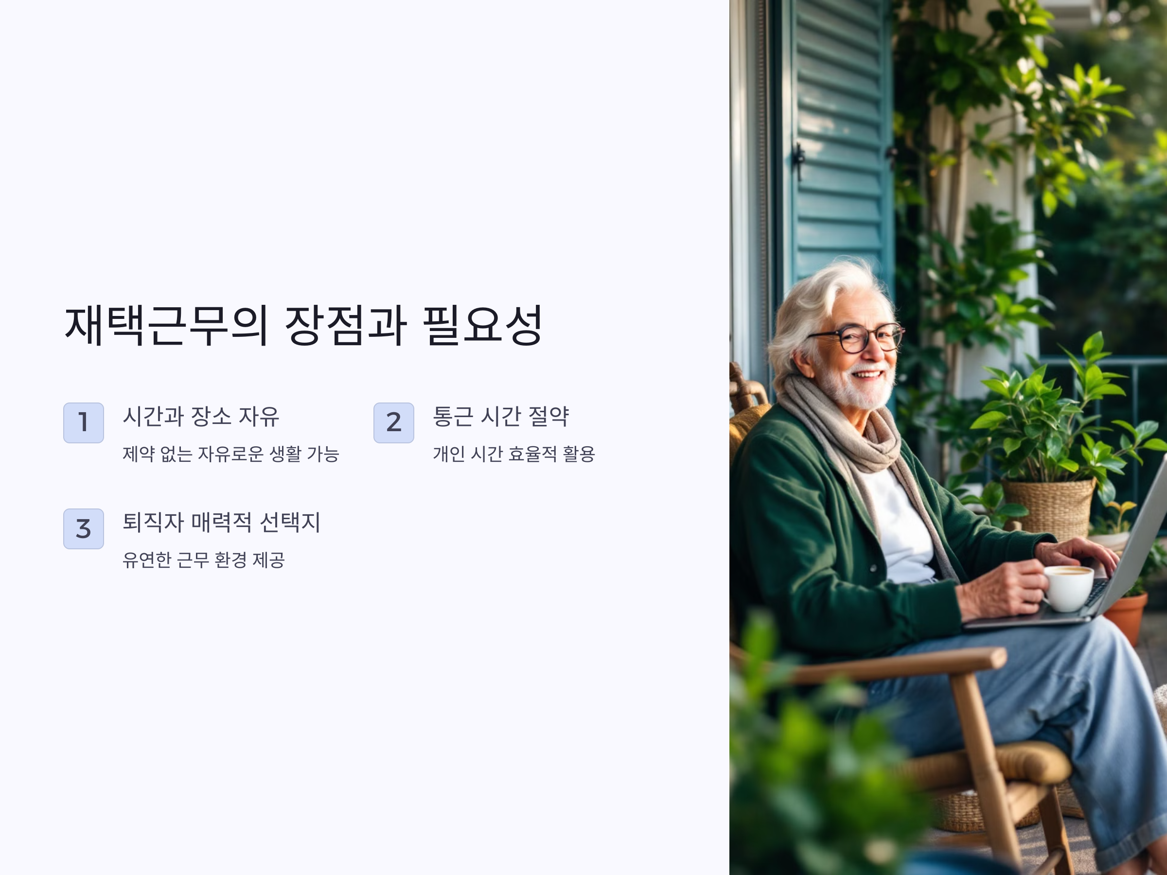 퇴직 후 재택근무를 선택하는 것은 여러 가지 이점이 있습니다. 우선, 시간과 장소의 제약이 없다는 점에서 자유로운 생활이 가능합니다. 또한, 통근 시간이 절약되어 개인 시간을 더욱 효율적으로 활용할 수 있습니다. 이러한 이유로 재택근무는 퇴직자들에게 매력적인 선택지가 되고 있습니다.