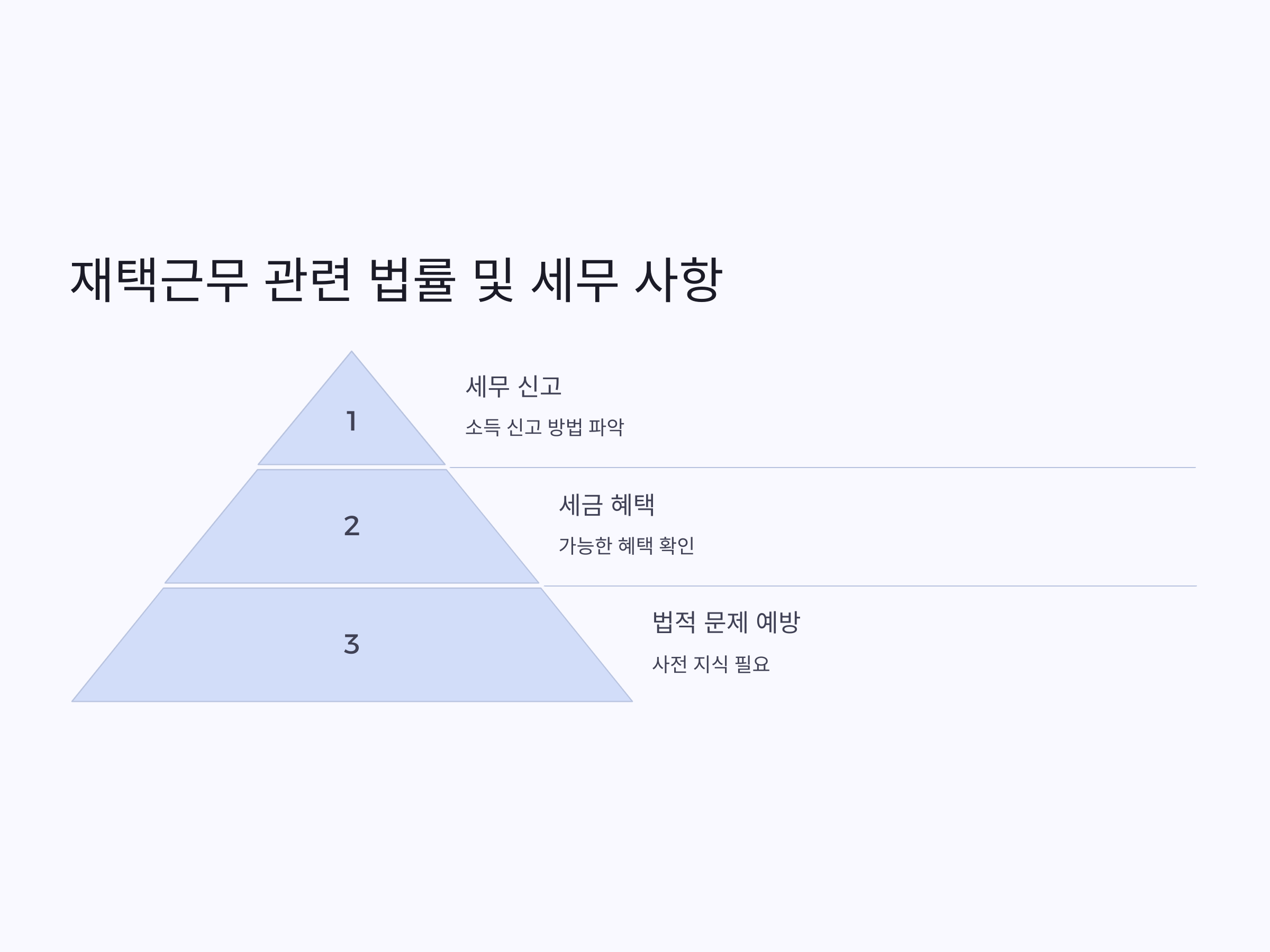 재택근무를 시작하기 전에 관련 법률 및 세무 사항을 확인하는 것이 중요합니다. 예를 들어, 프리랜서로서 소득을 얻을 경우 세무 신고를 어떻게 해야 하는지, 어떤 세금 혜택이 있는지 등을 사전에 파악해야 합니다. 이를 통해 불필요한 법적 문제를 예방할 수 있습니다.