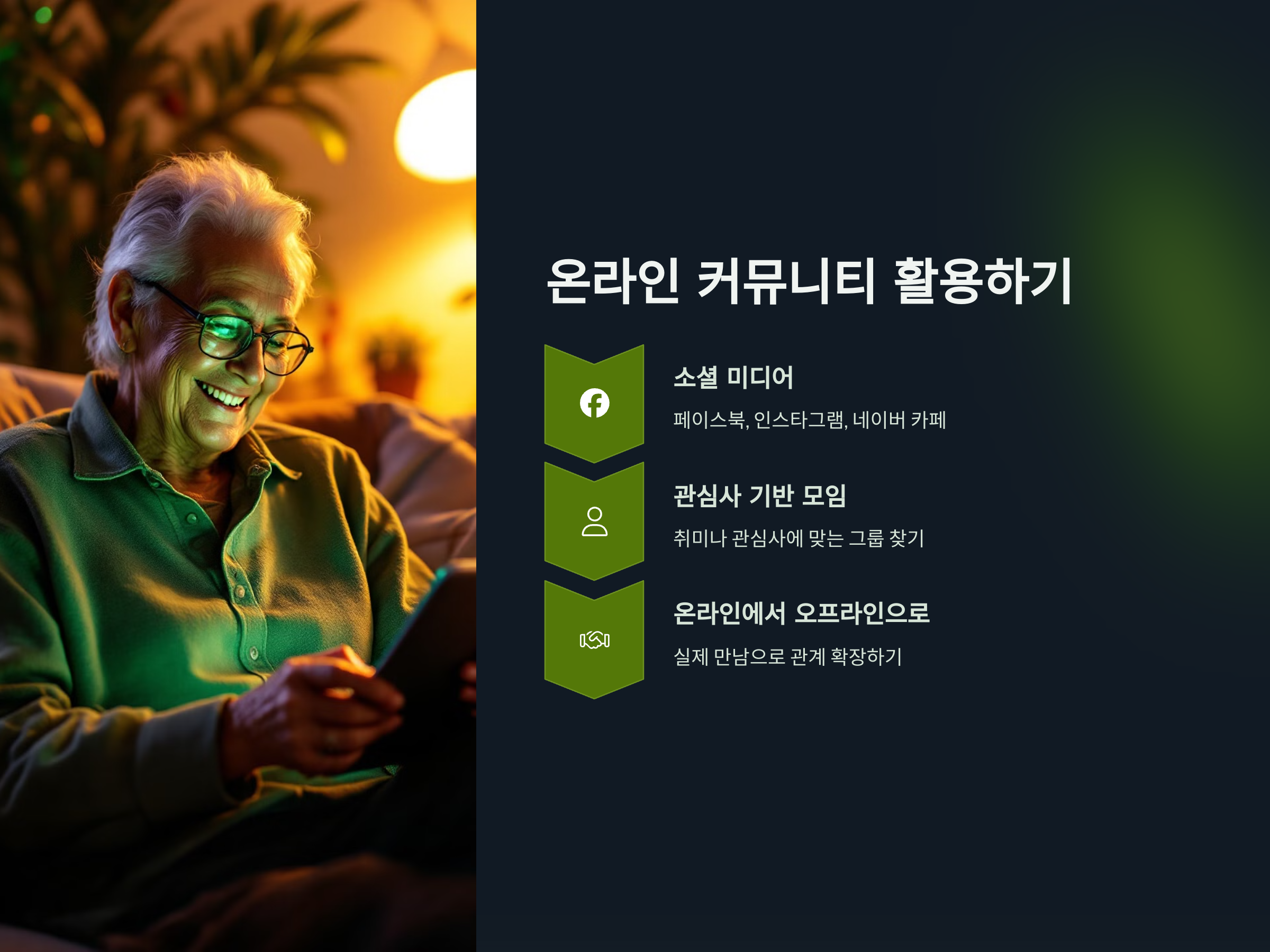 퇴직 후 새로운 친구를 만드는 또 다른 방법은 온라인 커뮤니티를 활용하는 것입니다. 최근에는 다양한 온라인 플랫폼이 활성화되어 있어, 지역 모임이나 관심사 기반의 모임을 쉽게 찾을 수 있습니다. 온라인 커뮤니티에서는 직장이나 생활 환경과 상관없이 다양한 배경을 가진 사람들과 소통할 수 있습니다.