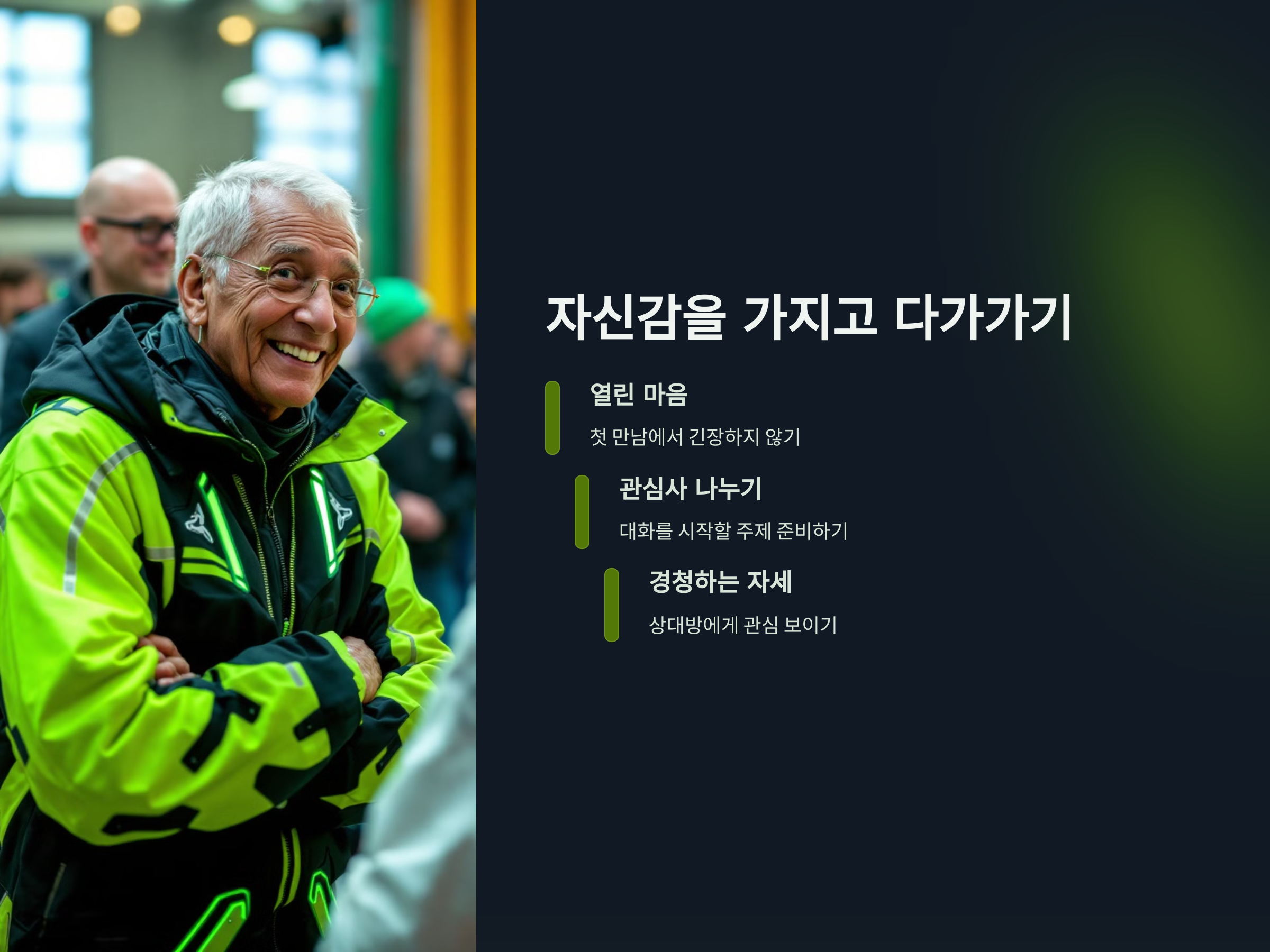 새로운 사람을 만날 때 가장 중요한 것은 자신감을 가지는 것입니다. 퇴직 후에는 사람들과의 만남이 자연스럽지 않게 느껴질 수 있지만, 자신감을 가지고 먼저 다가가면 새로운 친구들을 쉽게 사귈 수 있습니다. 첫 만남에서 너무 긴장하지 말고, 열린 마음으로 상대방에게 다가가세요.