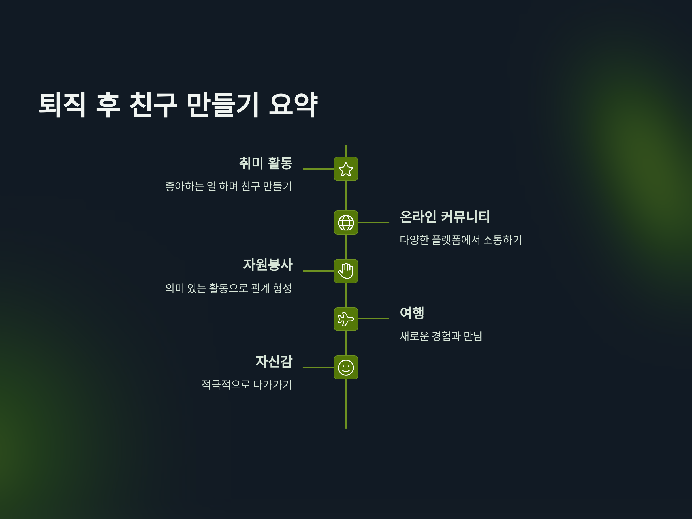 퇴직 후 새로운 친구를 만드는 방법은 매우 다양하지만, 핵심은 "적극적이고 열린 마음"을 가지는 것입니다. 그동안 직장에서의 일상에 묶여 있었던 사람이라면, 새로운 취미나 활동을 통해 자연스럽게 사람들과 소통을 시작할 수 있습니다. 특히 다양한 커뮤니티 활동이나 온라인 플랫폼을 활용하면 편리하게 새로운 사람들을 만날 수 있습니다.