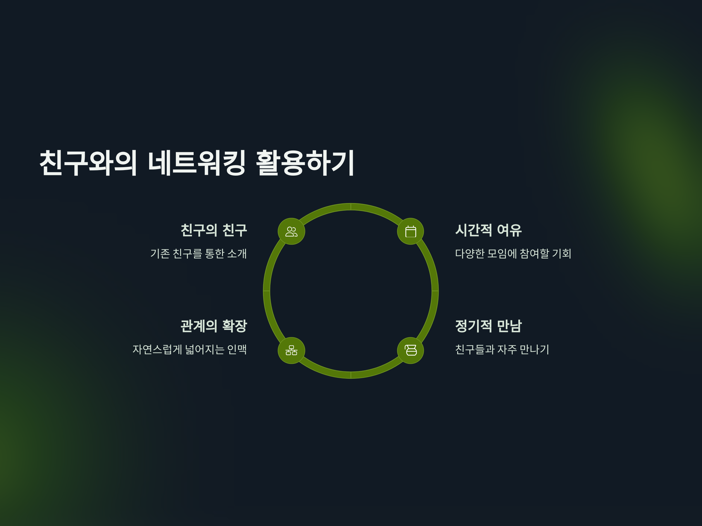 퇴직 후에는 기존의 친구들과의 관계를 활용해 새로운 사람들과 만날 수 있습니다. 친구나 지인에게 소개를 받거나, 네트워킹 모임에 참여하면, 다양한 사람들을 만날 기회를 얻을 수 있습니다. 친구의 친구들과 만날 수 있기 때문에 관계의 폭이 자연스럽게 넓어집니다.