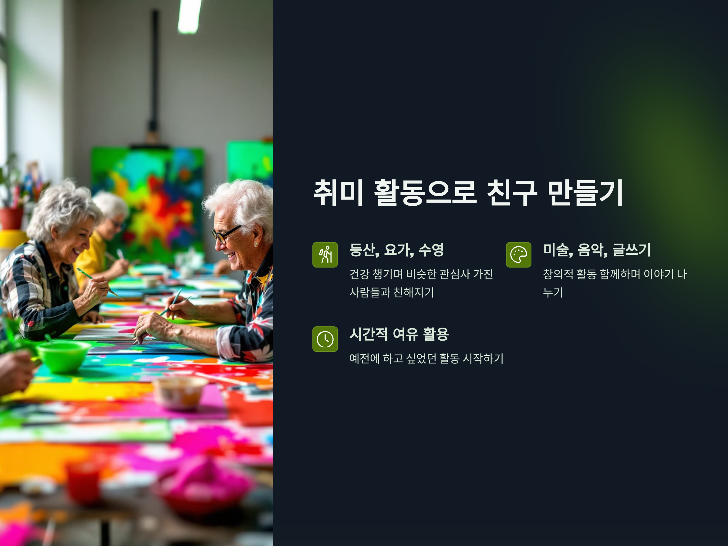 취미 활동은 자신이 좋아하는 일을 하면서 새로운 친구를 만날 수 있는 가장 좋은 방법 중 하나입니다. 퇴직 후에는 시간이 많기 때문에, 자신이 예전에 하고 싶었던 활동들을 시작해보는 것이 좋습니다. 취미 활동을 통해 새로운 사람들을 만나면서 자연스럽게 친구를 만들 수 있기 때문입니다.