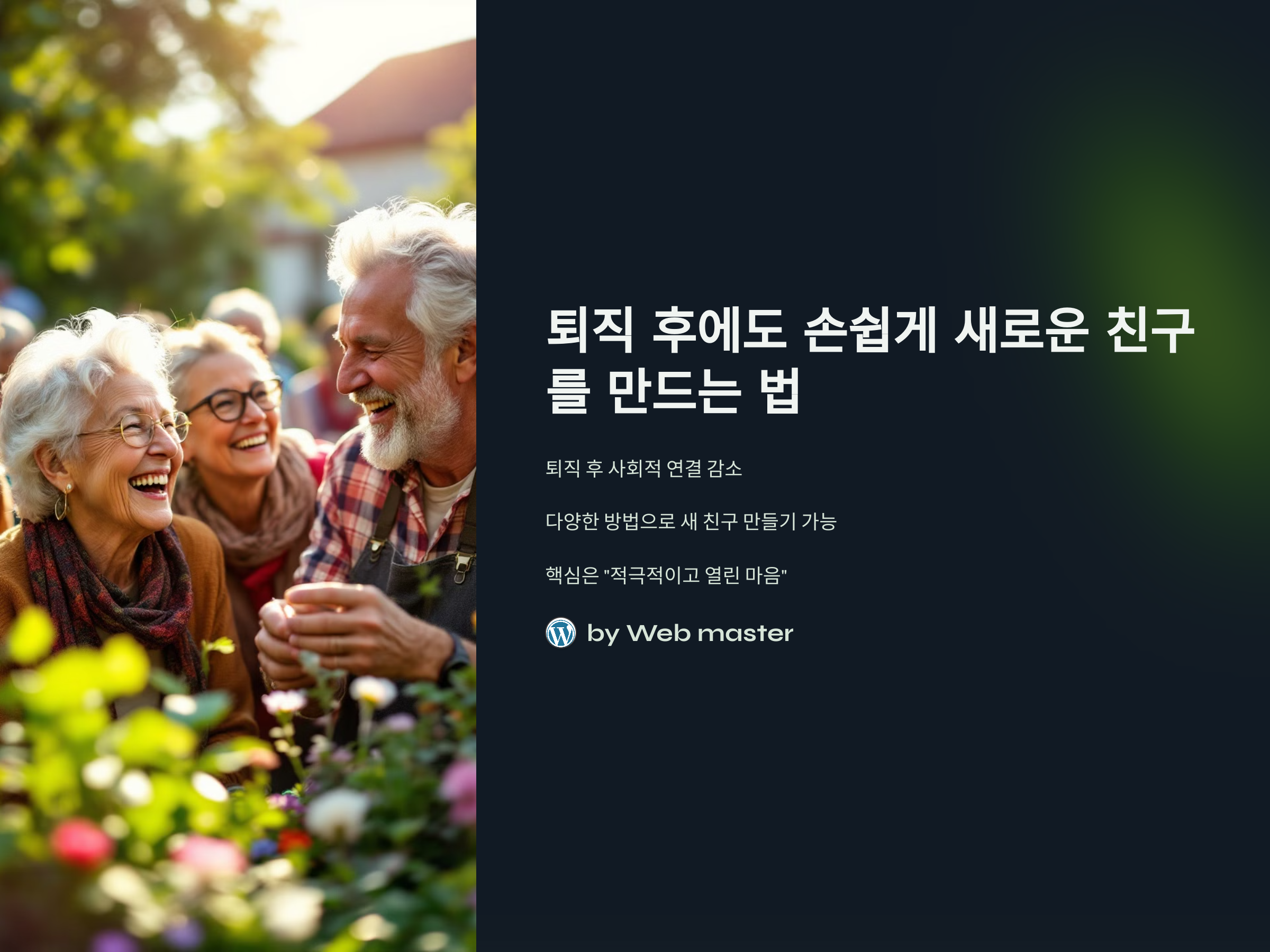 퇴직 후 새로운 사람들과의 만남은 다소 어려운 일처럼 느껴질 수 있습니다. 직장에서의 관계가 끝나면서 자연스럽게 사회적 연결이 줄어들기도 하고, 새로운 사람을 만나는 기회가 부족해지기 때문입니다. 하지만 퇴직 후에도 여전히 다양한 방법으로 새로운 친구를 만들 수 있습니다. 이 글에서는 퇴직 후 새로운 사람들과 쉽게 친구가 될 수 있는 몇 가지 방법을 소개하고자 합니다. 나이가 들어도 여전히 새로운 사람들과 좋은 관계를 형성하는 것이 가능합니다.