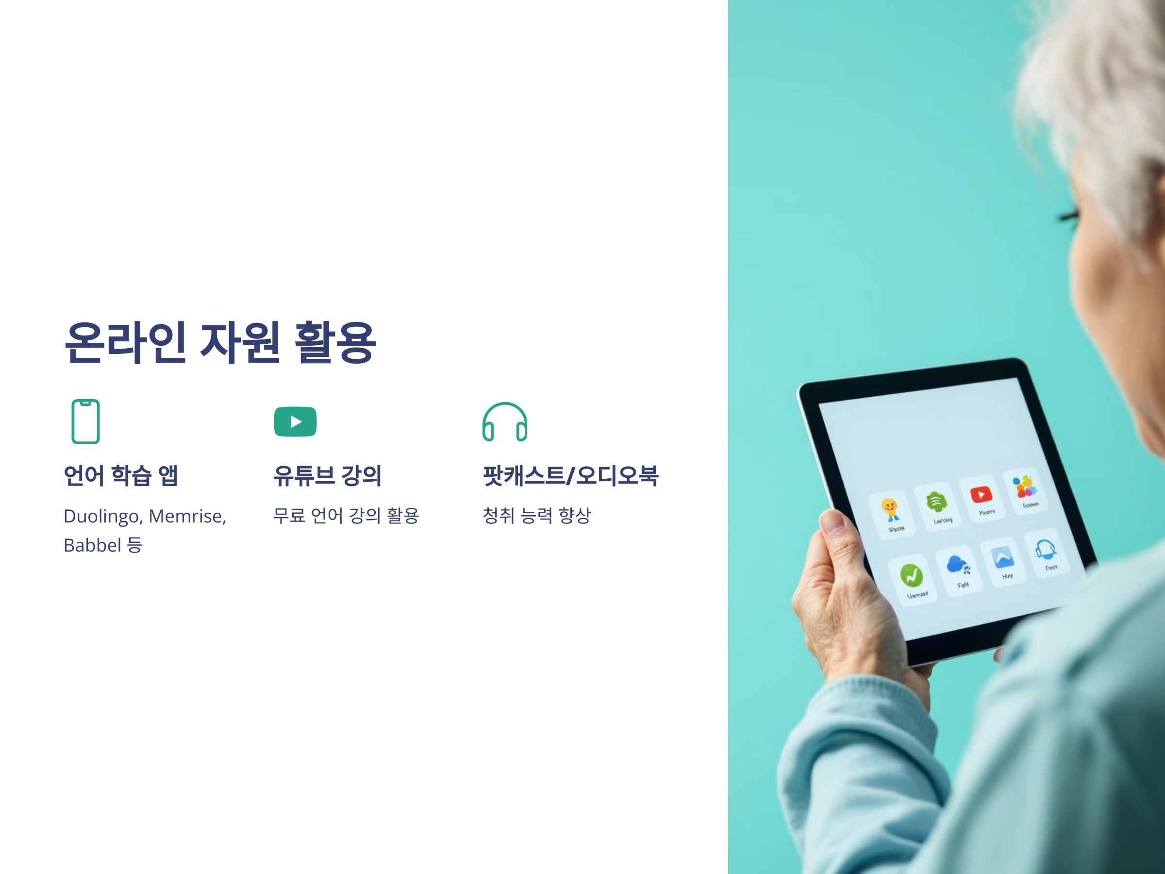 이 외에도 다양한 팟캐스트나 오디오북을 활용하여 외국어를 듣고 익힐 수 있습니다. 퇴직 후에는 이러한 자원을 통해 여러 번 반복하여 학습할 수 있는 기회가 주어지기 때문에, 짧은 시간이라도 꾸준히 학습하는 것이 중요합니다.